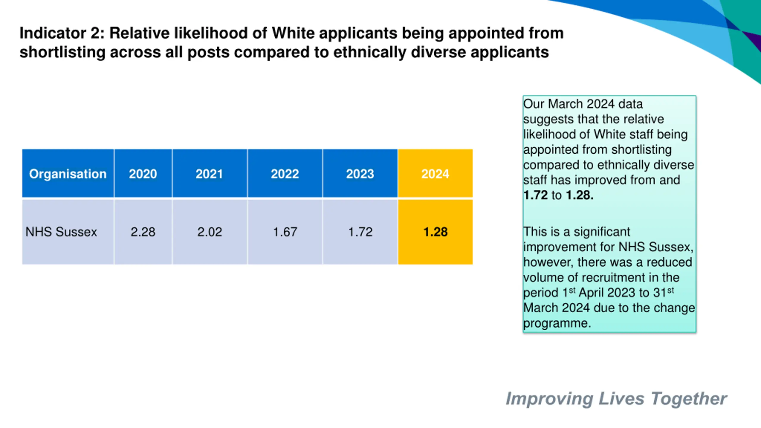 - Indicator 2: Relative likelihood of White applicants being appointed from shortlisting across all posts compared to ethnically diverse applicants Our March 2024 data suggests that the relative likelihood of White staff being appointed from shortlisting compared to ethnically diverse staff has improved from and 1.72 to 1.28. Organisation 2020 2021 2022 2023 2024 This is a significant improvement for NHS Sussex, however, there was a reduced volume of recruitment in the period 1st April 2023 to 31st March 2024 due to the change programme. NHS Sussex 2.28 2.02 1.67 1.72 1.28