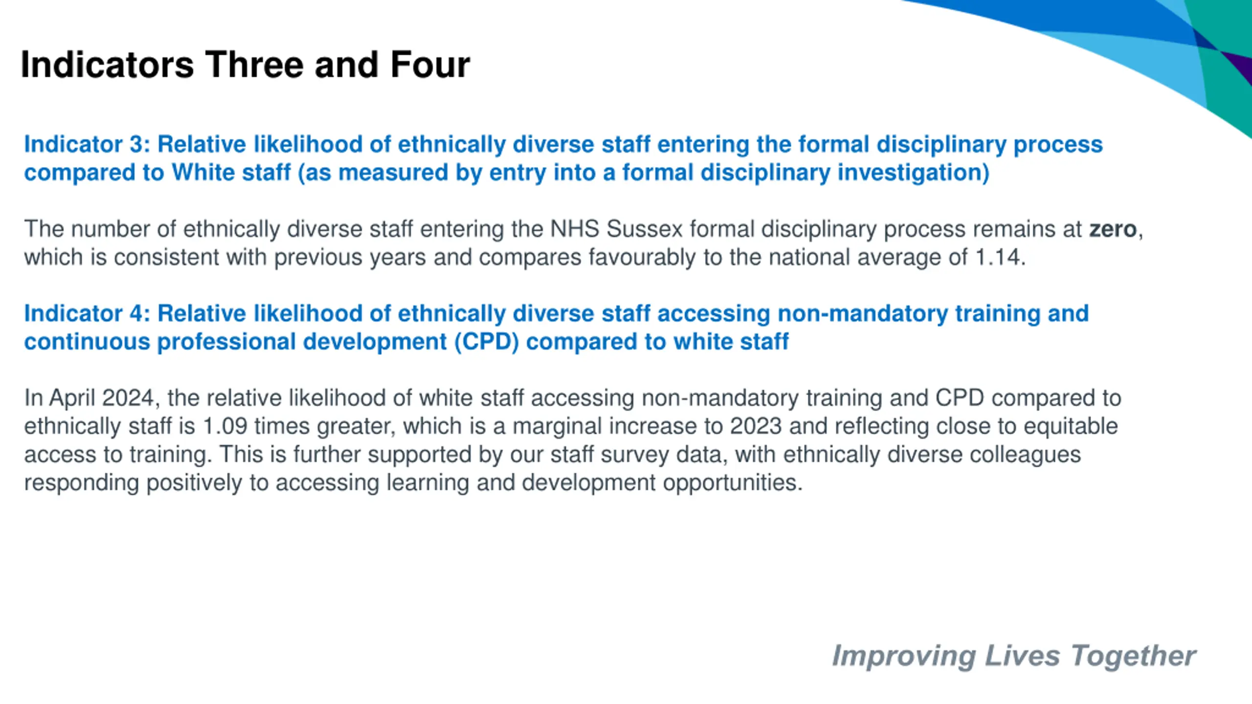- Indicators Three and Four Indicator 3: Relative likelihood of ethnically diverse staff entering the formal disciplinary process compared to White staff (as measured by entry into a formal disciplinary investigation) The number of ethnically diverse staff entering the NHS Sussex formal disciplinary process remains at zero, which is consistent with previous years and compares favourably to the national average of 1.14. Indicator 4: Relative likelihood of ethnically diverse staff accessing non-mandatory training and continuous professional development (CPD) compared to white staff In April 2024, the relative likelihood of white staff accessing non-mandatory training and CPD compared to ethnically staff is 1.09 times greater, which is a marginal increase to 2023 and reflecting close to equitable access to training. This is further supported by our staff survey data, with ethnically diverse colleagues responding positively to accessing learning and development opportunities.