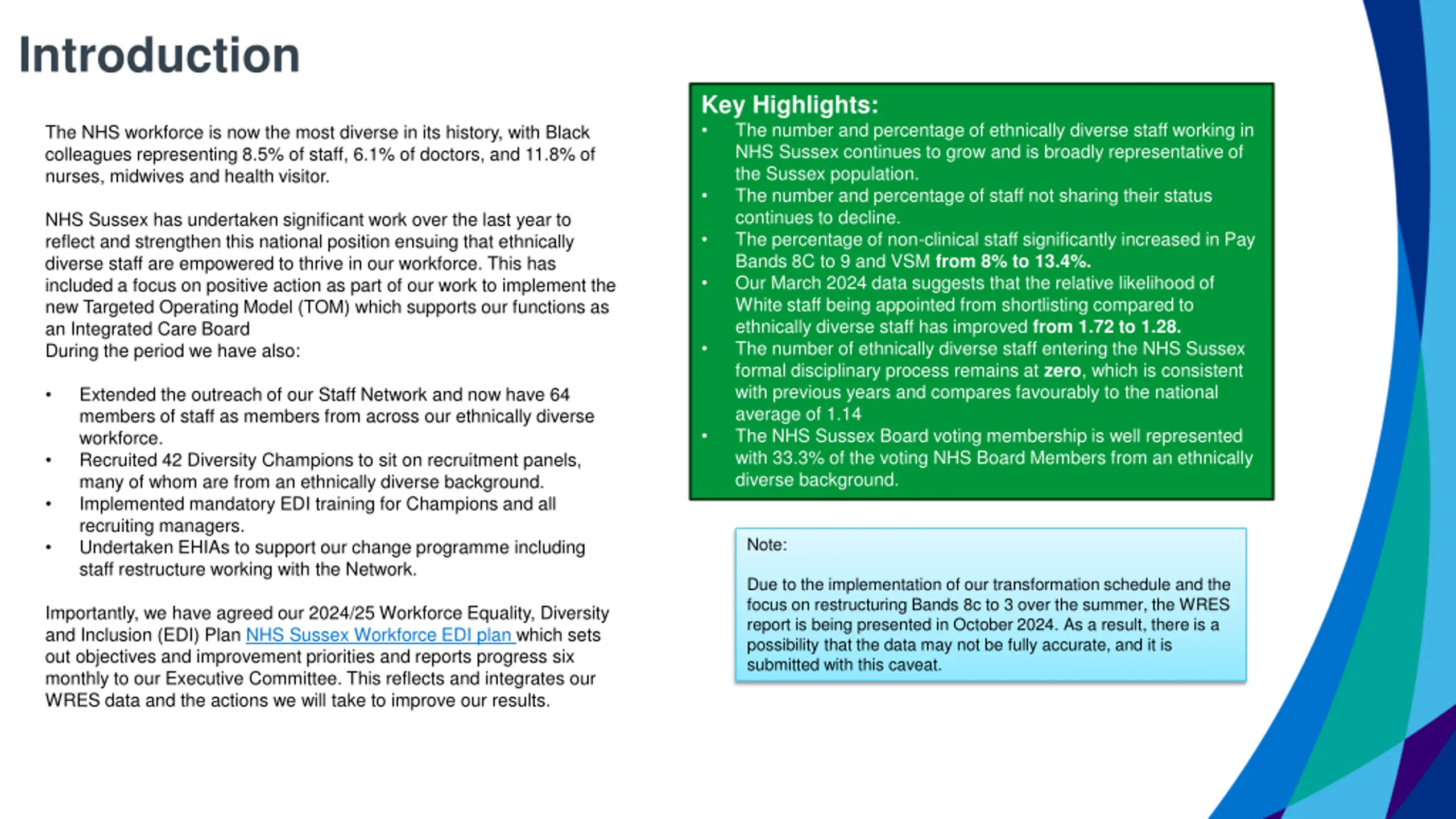 - Introduction Key Highlights: The number and percentage of ethnically diverse staff working in NHS Sussex continues to grow and is broadly representative of the Sussex population. The number and percentage of staff not sharing their status continues to decline. The percentage of non-clinical staff significantly increased in Pay Bands 8C to 9 and VSM from 8% to 13.4%. Our March 2024 data suggests that the relative likelihood of White staff being appointed from shortlisting compared to ethnically diverse staff has improved from 1.72 to 1.28. The number of ethnically diverse staff entering the NHS Sussex formal disciplinary process remains at zero, which is consistent with previous years and compares favourably to the national average of 1.14 The NHS Sussex Board voting membership is well represented with 33.3% of the voting NHS Board Members from an ethnically diverse background. The NHS workforce is now the most diverse in its history, with Black colleagues representing 8.5% of staff, 6.1% of doctors, and 11.8% of nurses, midwives and health visitor. NHS Sussex has undertaken significant work over the last year to reflect and strengthen this national position ensuing that ethnically diverse staff are empowered to thrive in our workforce. This has included a focus on positive action as part of our work to implement the new Targeted Operating Model (TOM) which supports our functions as an Integrated Care Board During the period we have also: Extended the outreach of our Staff Network and now have 64 members of staff as members from across our ethnically diverse workforce. Recruited 42 Diversity Champions to sit on recruitment panels, many of whom are from an ethnically diverse background. Implemented mandatory EDI training for Champions and all recruiting managers. Undertaken EHIAs to support our change programme including staff restructure working with the Network. Note: Due to the implementation of our transformation schedule and the focus on restructuring Bands 8c to 3 over the summer, the WRES report is being presented in October 2024. As a result, there is a possibility that the data may not be fully accurate, and it is submitted with this caveat. Importantly, we have agreed our 2024/25 Workforce Equality, Diversity and Inclusion (EDI) Plan NHS Sussex Workforce EDI plan which sets out objectives and improvement priorities and reports progress six monthly to our Executive Committee. This reflects and integrates our WRES data and the actions we will take to improve our results.
