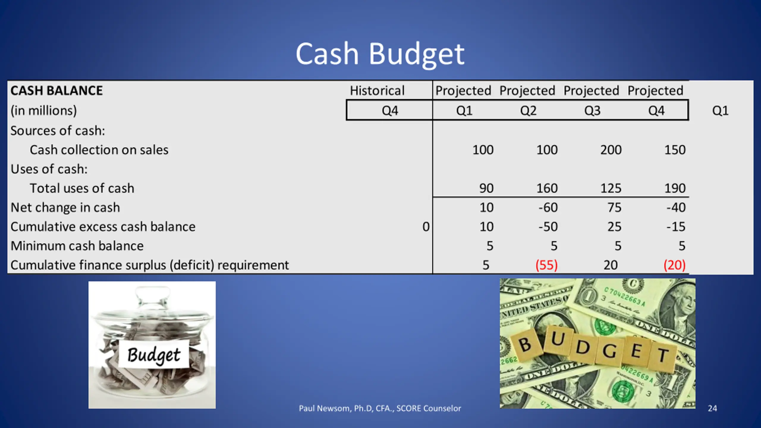 Cash Budget CASH BALANCE (in millions) Sources of cash: Cash collection on sales Uses of cash: Total uses of cash Net change in cash Cumulative excess cash balance Minimum cash balance Cumulative finance surplus (deficit) requirement Historical Projected Projected Projected Projected Q1 Q2 Q4 Q3 Q4 Q1 100 100 200 150 90 10 10 5 5 160 -60 -50 125 75 25 190 -40 -15 0 5 5 5 (55) 20 (20) Paul Newsom, Ph.D, CFA., SCORE Counselor 24