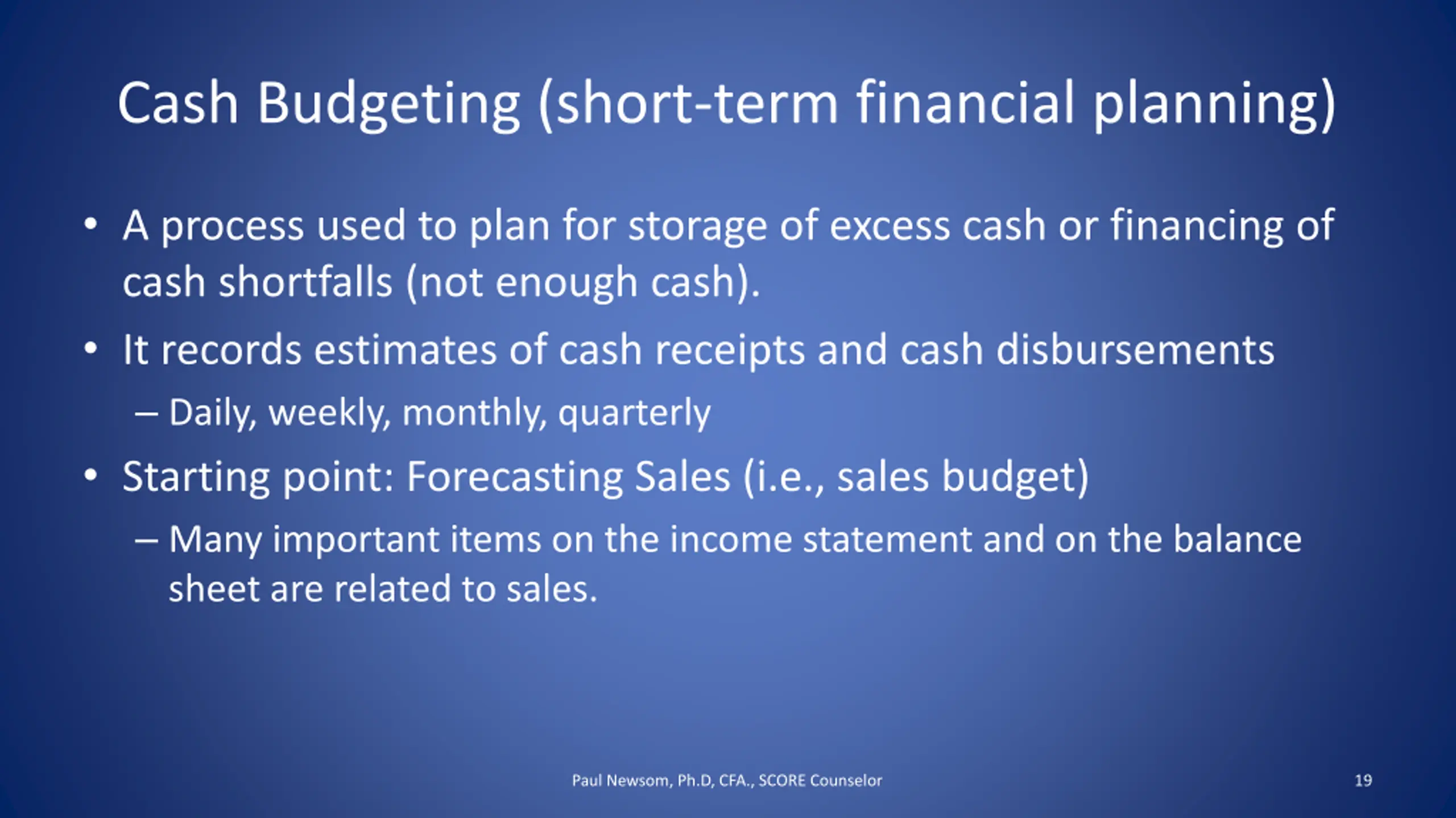 Cash Budgeting (short-term financial planning) A process used to plan for storage of excess cash or financing of cash shortfalls (not enough cash). It records estimates of cash receipts and cash disbursements Daily, weekly, monthly, quarterly Starting point: Forecasting Sales (i.e., sales budget) Many important items on the income statement and on the balance sheet are related to sales. Paul Newsom, Ph.D, CFA., SCORE Counselor 19