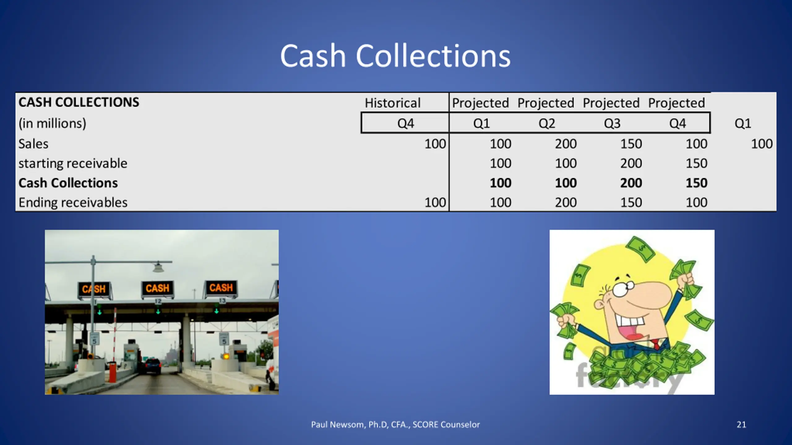 Cash Collections CASH COLLECTIONS (in millions) Sales starting receivable Cash Collections Ending receivables Historical Projected Projected Projected Projected Q1 Q2 100 200 100 100 100 100 100 200 Q4 Q3 Q4 Q1 100 150 200 200 150 100 150 150 100 100 100 Paul Newsom, Ph.D, CFA., SCORE Counselor 21