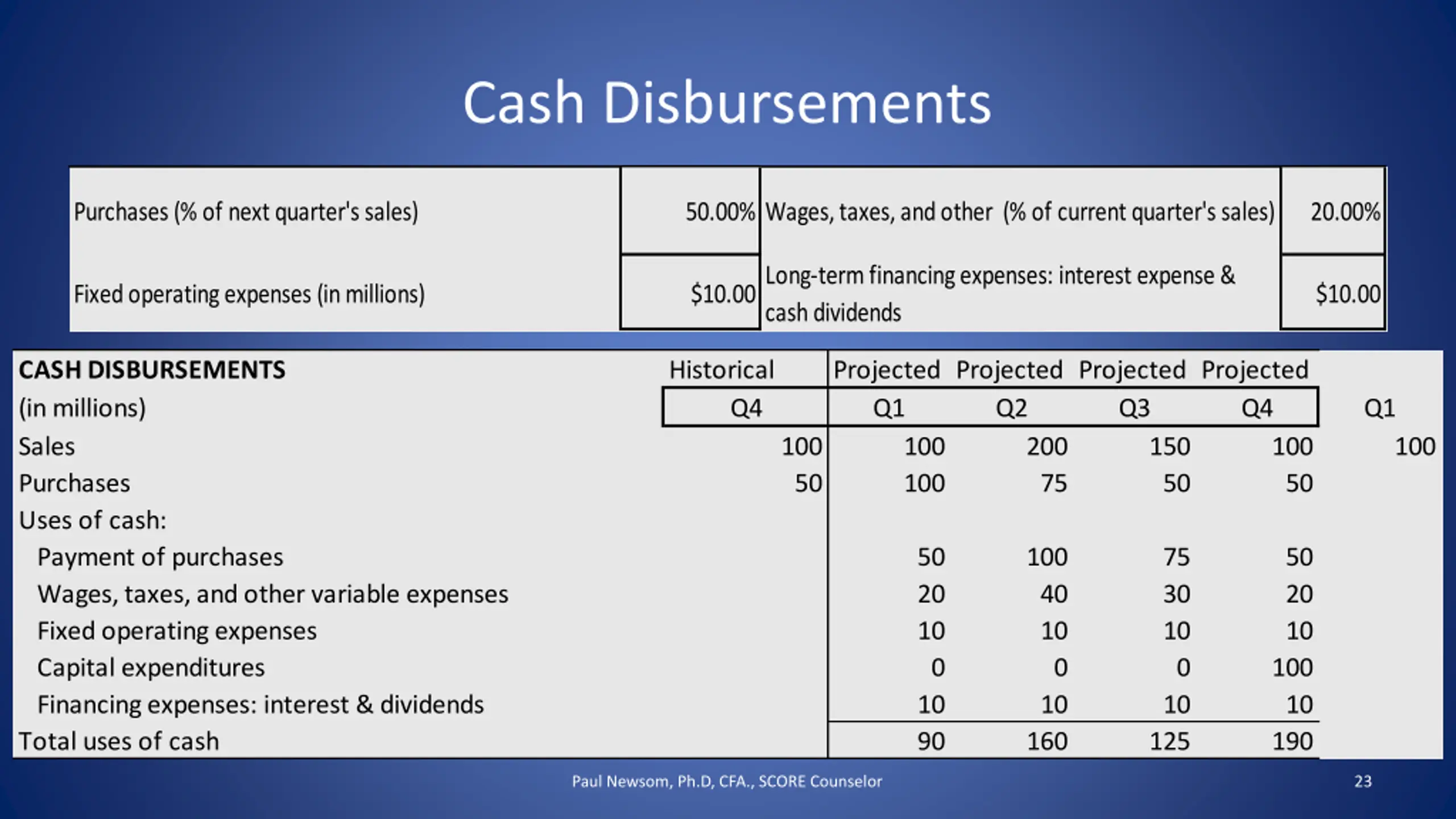 Cash Disbursements Purchases (% of next quarter's sales) 50.00% Wages, taxes, and other (% of current quarter's sales) 20.00% Long-term financing expenses: interest expense & cash dividends Fixed operating expenses (in millions) $10.00 $10.00 CASH DISBURSEMENTS (in millions) Sales Purchases Uses of cash: Payment of purchases Wages, taxes, and other variable expenses Fixed operating expenses Capital expenditures Financing expenses: interest & dividends Total uses of cash Historical Projected Projected Projected Projected Q1 Q2 100 200 100 75 Q4 Q3 Q4 Q1 100 50 150 50 100 50 100 50 20 10 0 10 90 100 40 10 75 30 10 0 10 125 50 20 10 100 10 190 0 10 160 Paul Newsom, Ph.D, CFA., SCORE Counselor 23
