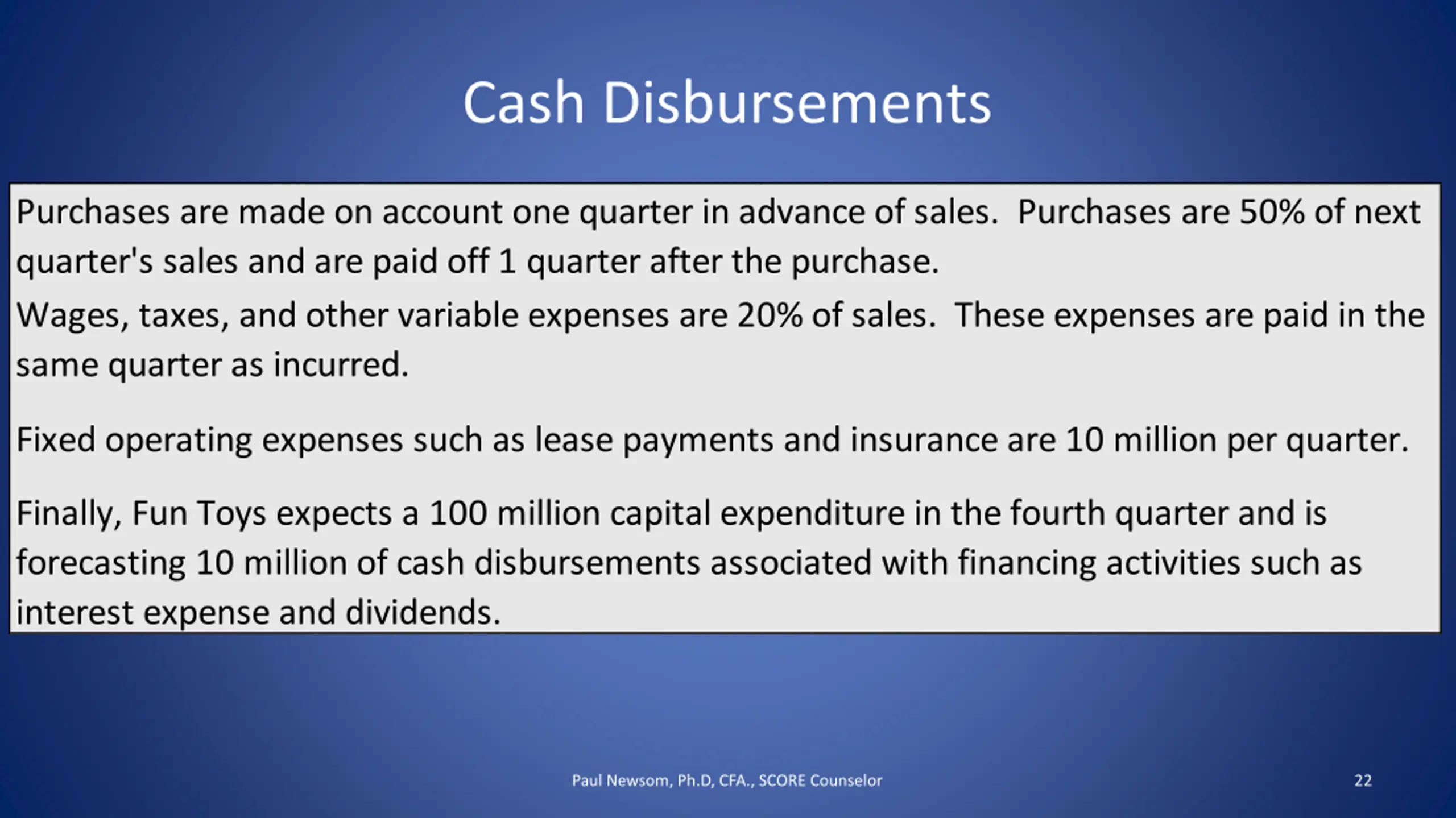 Cash Disbursements Purchases are made on account one quarter in advance of sales. Purchases are 50% of next quarter's sales and are paid off 1 quarter after the purchase. Wages, taxes, and other variable expenses are 20% of sales. These expenses are paid in the same quarter as incurred. Fixed operating expenses such as lease payments and insurance are 10 million per quarter. Finally, Fun Toys expects a 100 million capital expenditure in the fourth quarter and is forecasting 10 million of cash disbursements associated with financing activities such as interest expense and dividends. Paul Newsom, Ph.D, CFA., SCORE Counselor 22
