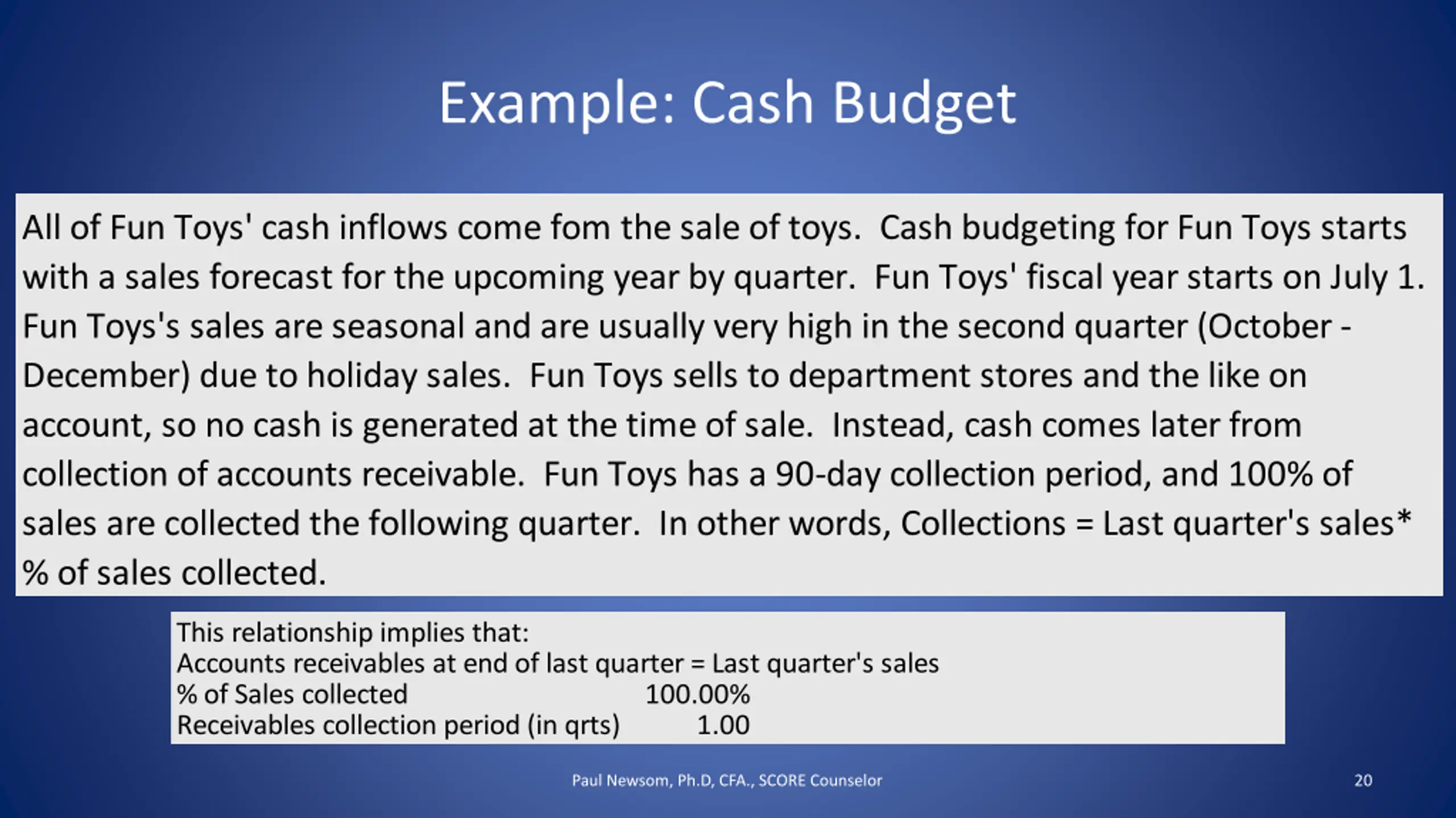 Example: Cash Budget All of Fun Toys' cash inflows come fom the sale of toys. Cash budgeting for Fun Toys starts with a sales forecast for the upcoming year by quarter. Fun Toys' fiscal year starts on July 1. Fun Toys's sales are seasonal and are usually very high in the second quarter (October - December) due to holiday sales. Fun Toys sells to department stores and the like on account, so no cash is generated at the time of sale. Instead, cash comes later from collection of accounts receivable. Fun Toys has a 90-day collection period, and 100% of sales are collected the following quarter. In other words, Collections = Last quarter's sales* % of sales collected. This relationship implies that: Accounts receivables at end of last quarter = Last quarter's sales % of Sales collected Receivables collection period (in qrts) 100.00% 1.00 Paul Newsom, Ph.D, CFA., SCORE Counselor 20