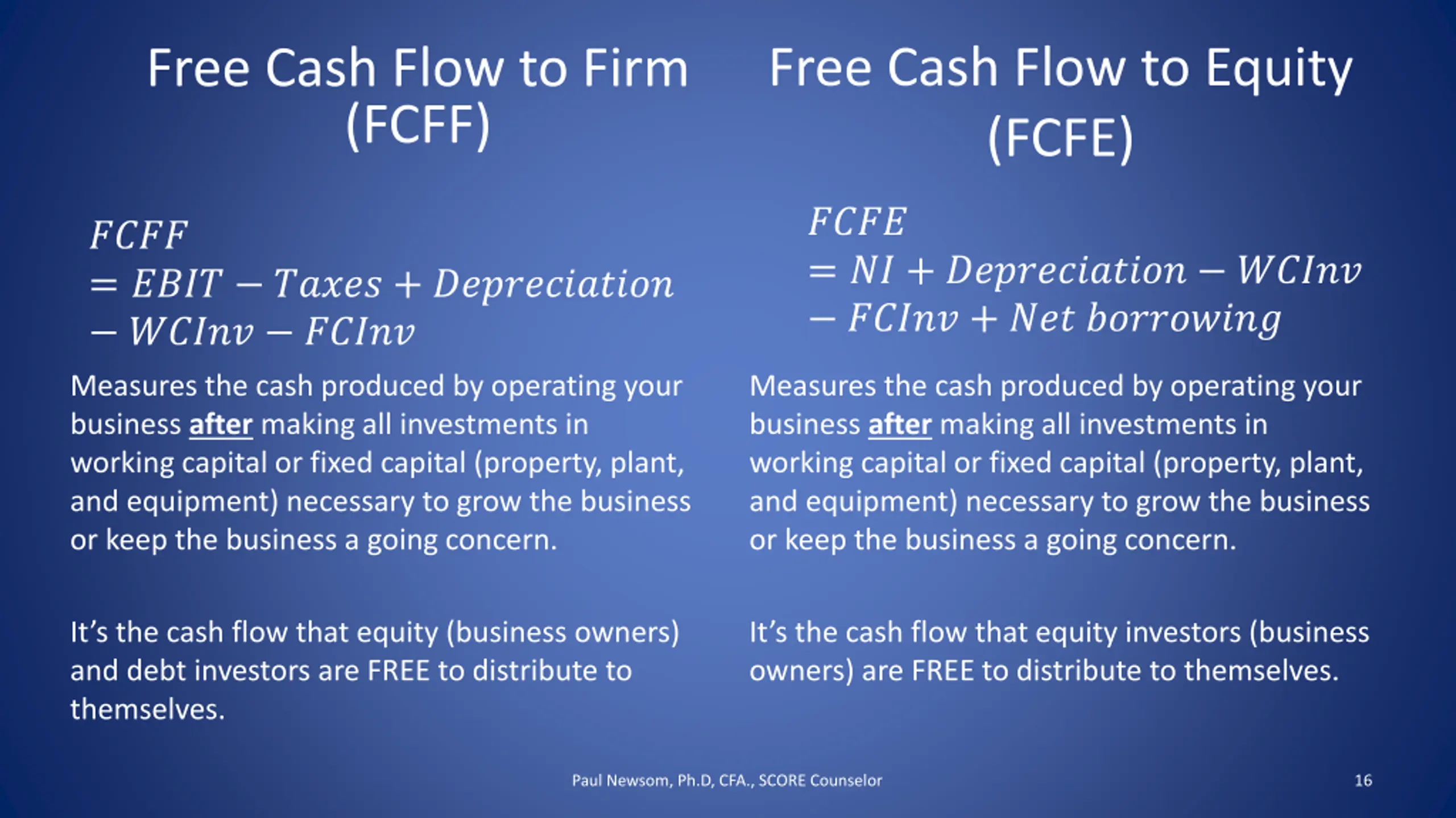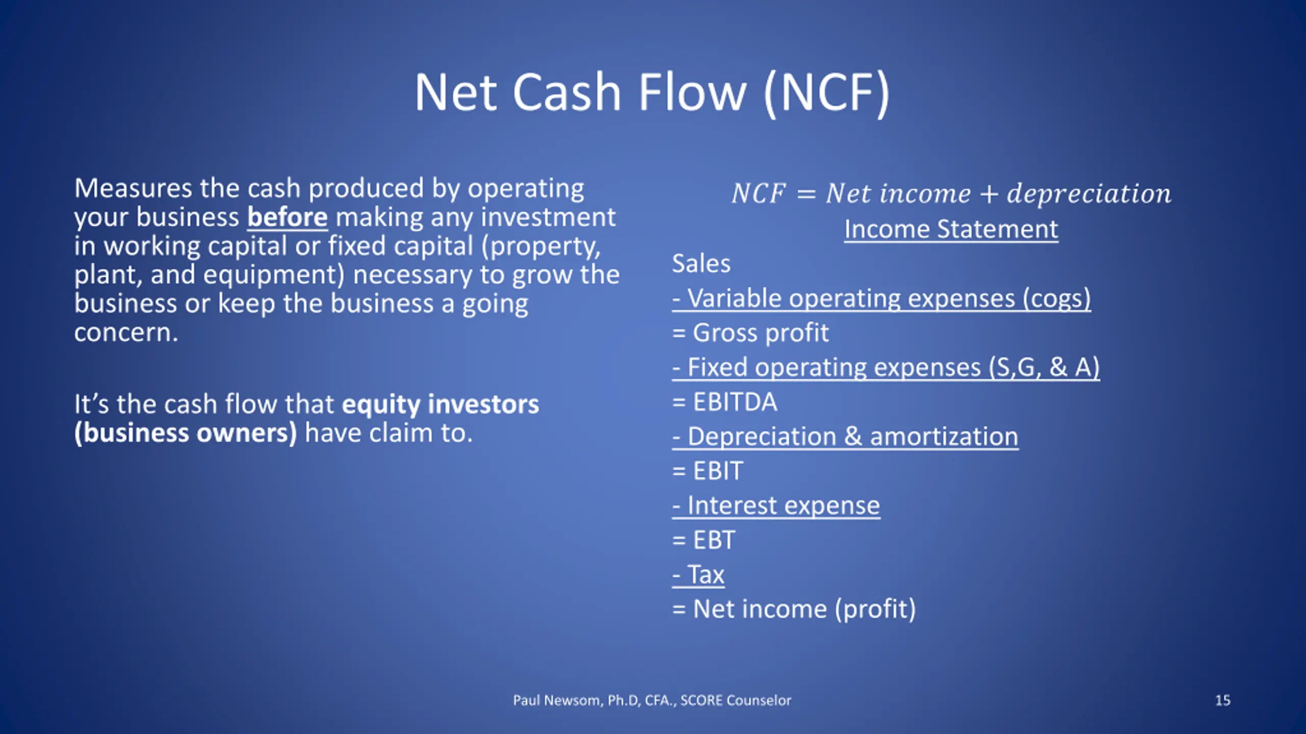 Net Cash Flow (NCF) Measures the cash produced by operating your business before making any investment in working capital or fixed capital (property, plant, and equipment) necessary to grow the business or keep the business a going concern. ??? = ??? ?????? + ???????????? Income Statement Sales - Variable operating expenses (cogs) = Gross profit - Fixed operating expenses (S,G, & A) = EBITDA - Depreciation & amortization = EBIT - Interest expense = EBT - Tax = Net income (profit) It s the cash flow that equity investors (business owners) have claim to. Paul Newsom, Ph.D, CFA., SCORE Counselor 15