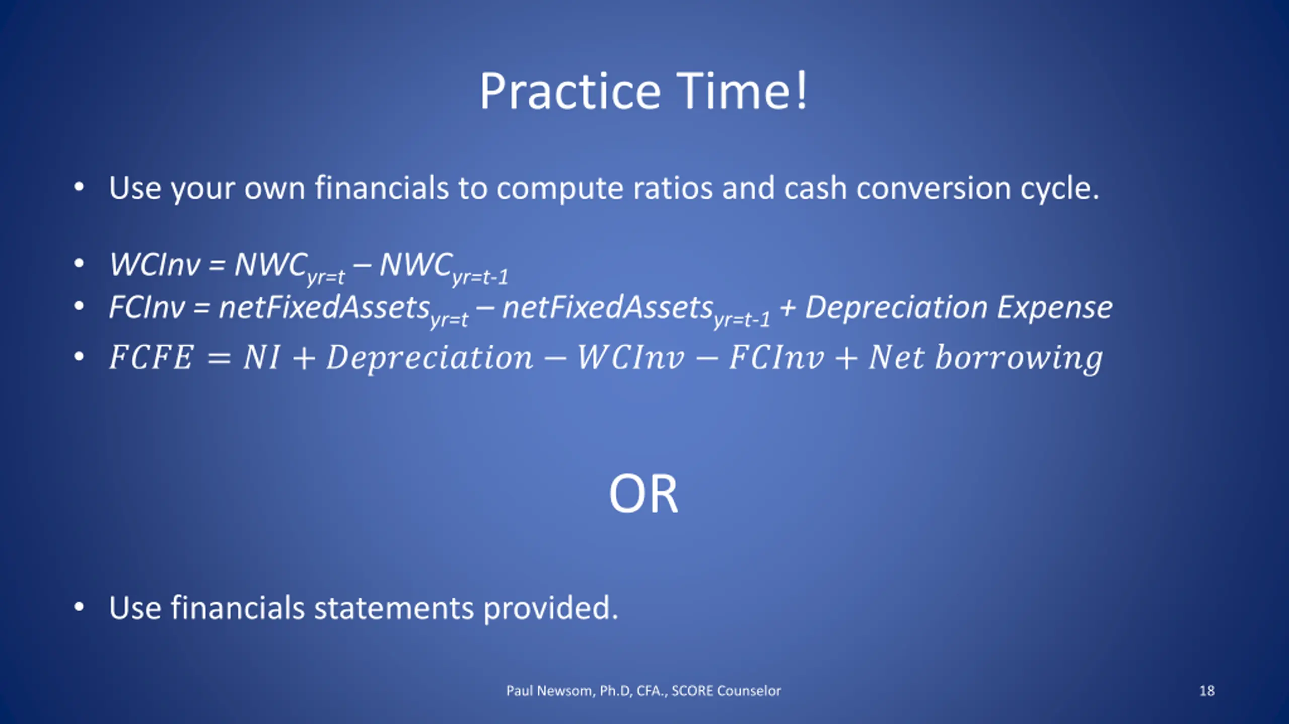Practice Time! Use your own financials to compute ratios and cash conversion cycle. WCInv = NWCyr=t NWCyr=t-1 FCInv = netFixedAssetsyr=t netFixedAssetsyr=t-1 + Depreciation Expense ???? = ?? + ???????????? ????? ????? + ??? ????????? OR Use financials statements provided. Paul Newsom, Ph.D, CFA., SCORE Counselor 18