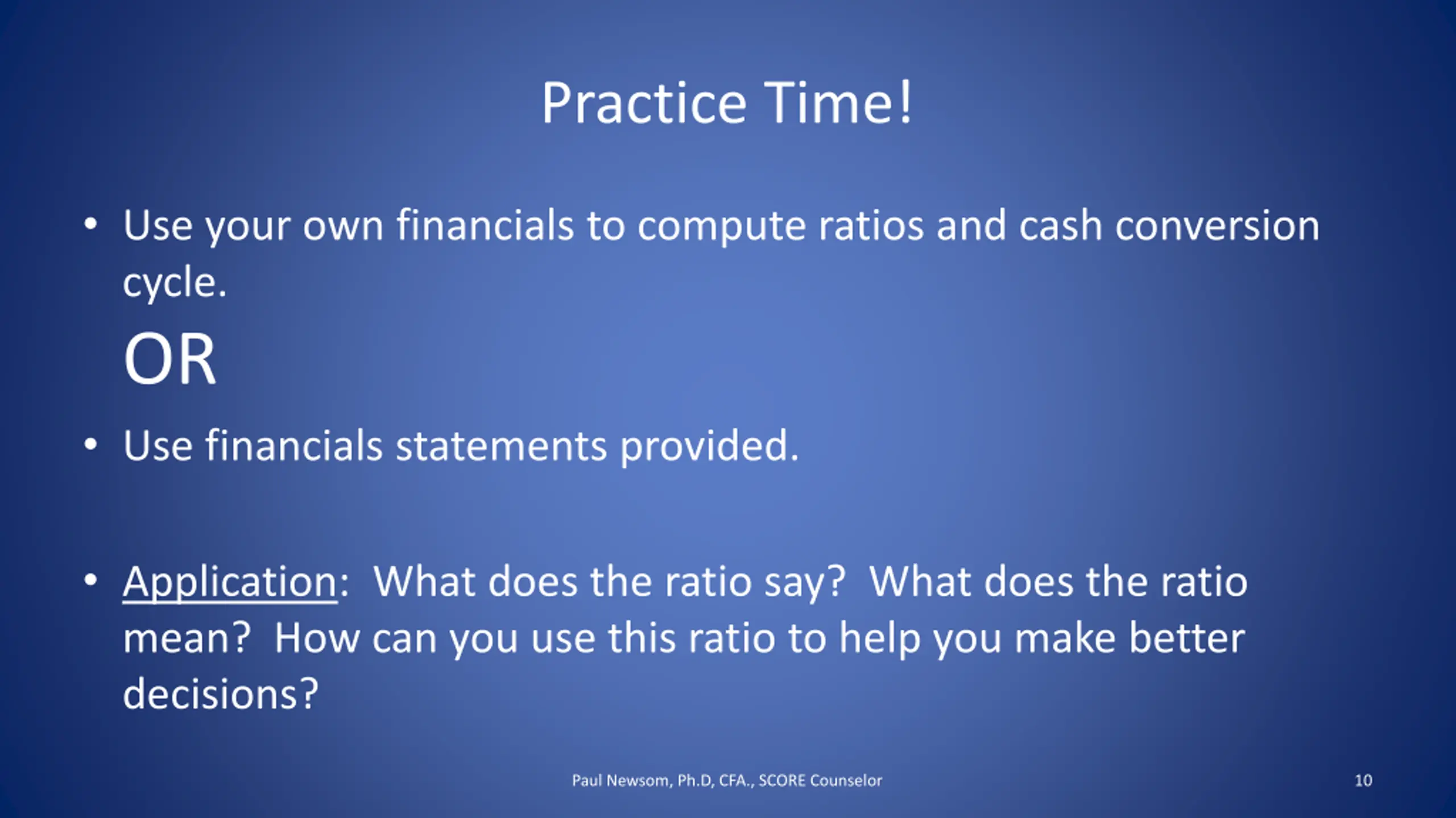 Practice Time! Use your own financials to compute ratios and cash conversion cycle. OR Use financials statements provided. Application: What does the ratio say? What does the ratio mean? How can you use this ratio to help you make better decisions? Paul Newsom, Ph.D, CFA., SCORE Counselor 10