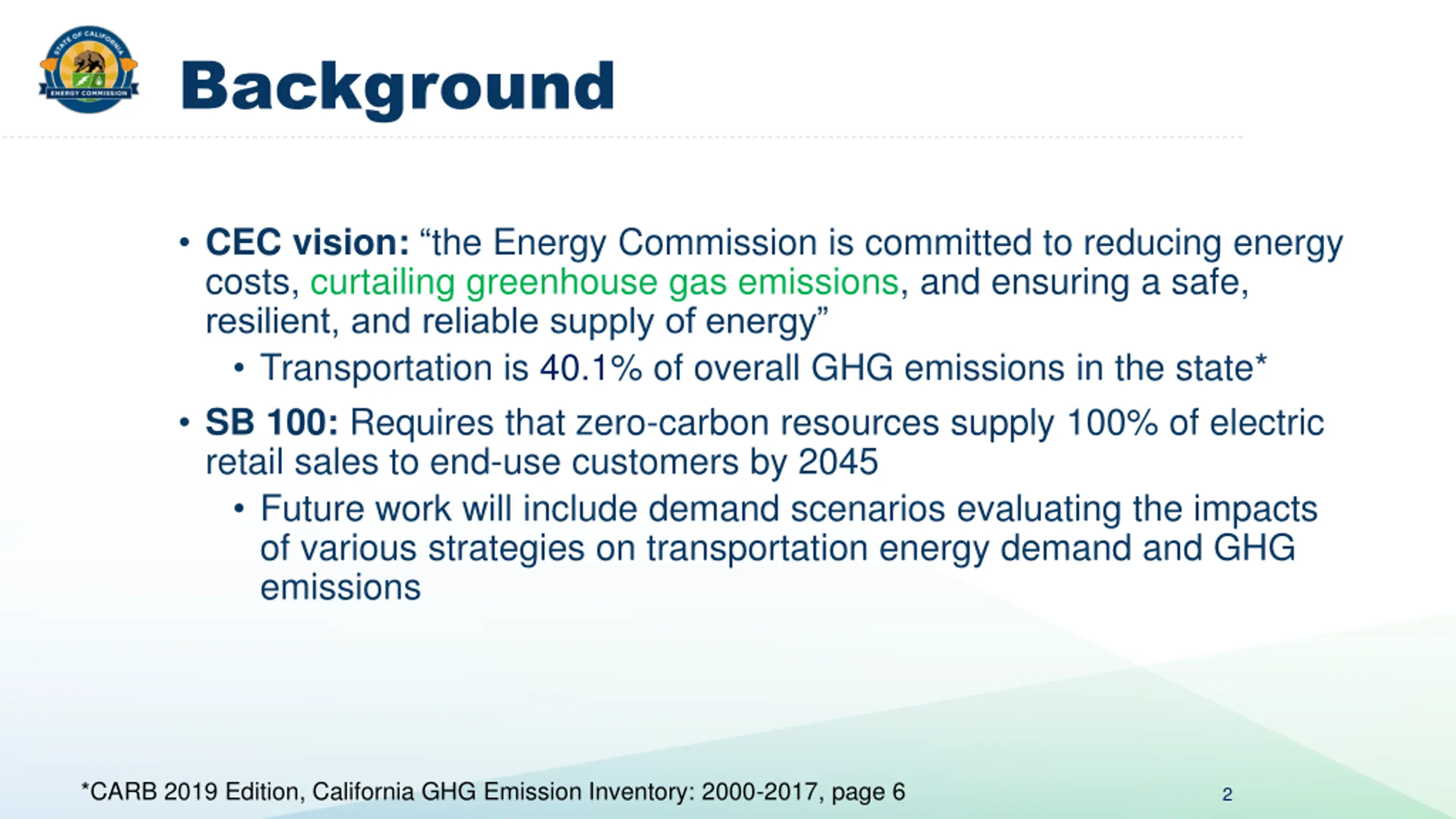 Background CEC vision: the Energy Commission is committed to reducing energy costs, curtailing greenhouse gas emissions, and ensuring a safe, resilient, and reliable supply of energy Transportation is 40.1% of overall GHG emissions in the state* SB 100: Requires that zero-carbon resources supply 100% of electric retail sales to end-use customers by 2045 Future work will include demand scenarios evaluating the impacts of various strategies on transportation energy demand and GHG emissions *CARB 2019 Edition, California GHG Emission Inventory: 2000-2017, page 6 2