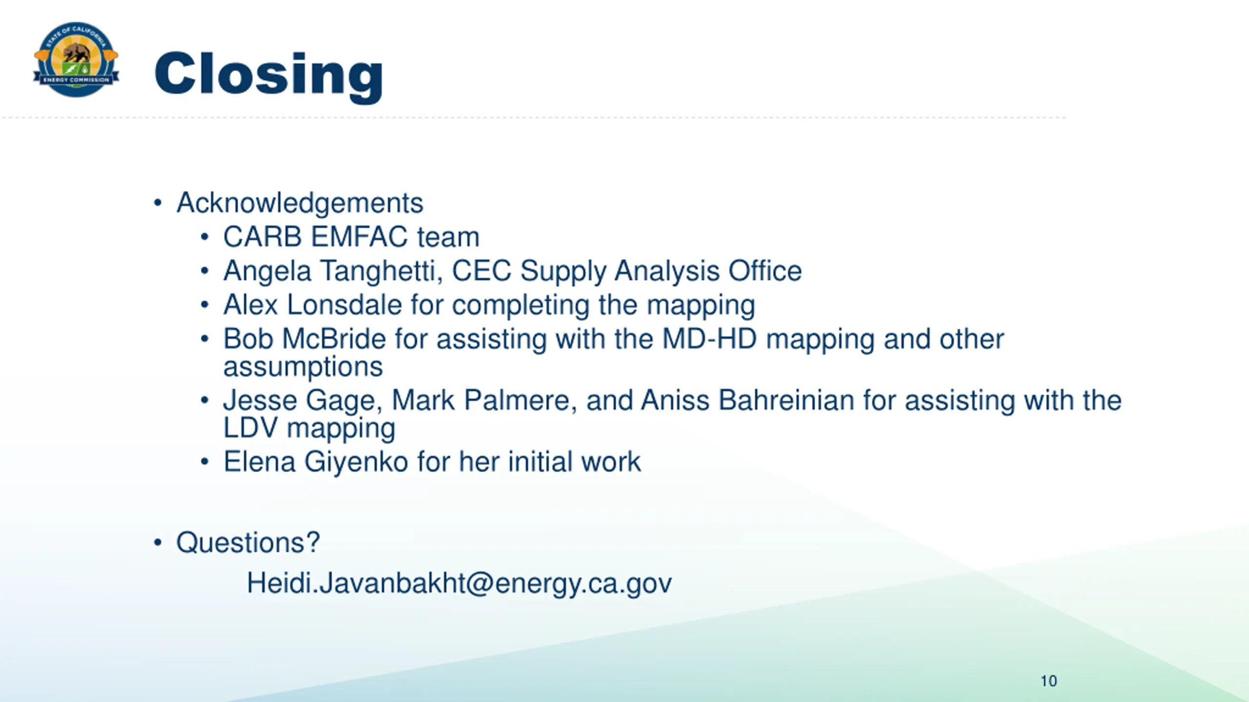 Closing Acknowledgements CARB EMFAC team Angela Tanghetti, CEC Supply Analysis Office Alex Lonsdale for completing the mapping Bob McBride for assisting with the MD-HD mapping and other assumptions Jesse Gage, Mark Palmere, and Aniss Bahreinian for assisting with the LDV mapping Elena Giyenko for her initial work Questions? Heidi.Javanbakht@energy.ca.gov 10
