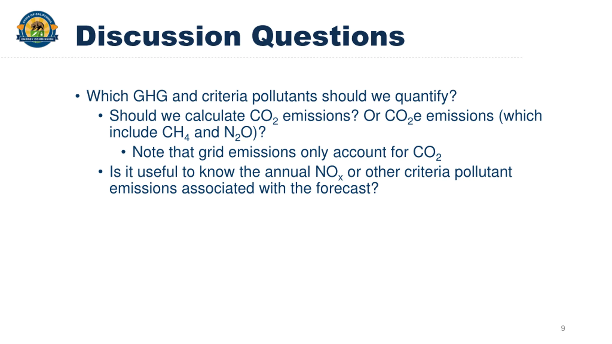 Discussion Questions Which GHG and criteria pollutants should we quantify? Should we calculate CO2 emissions? Or CO2e emissions (which include CH4 and N2O)? Note that grid emissions only account for CO2 Is it useful to know the annual NOx or other criteria pollutant emissions associated with the forecast? 9