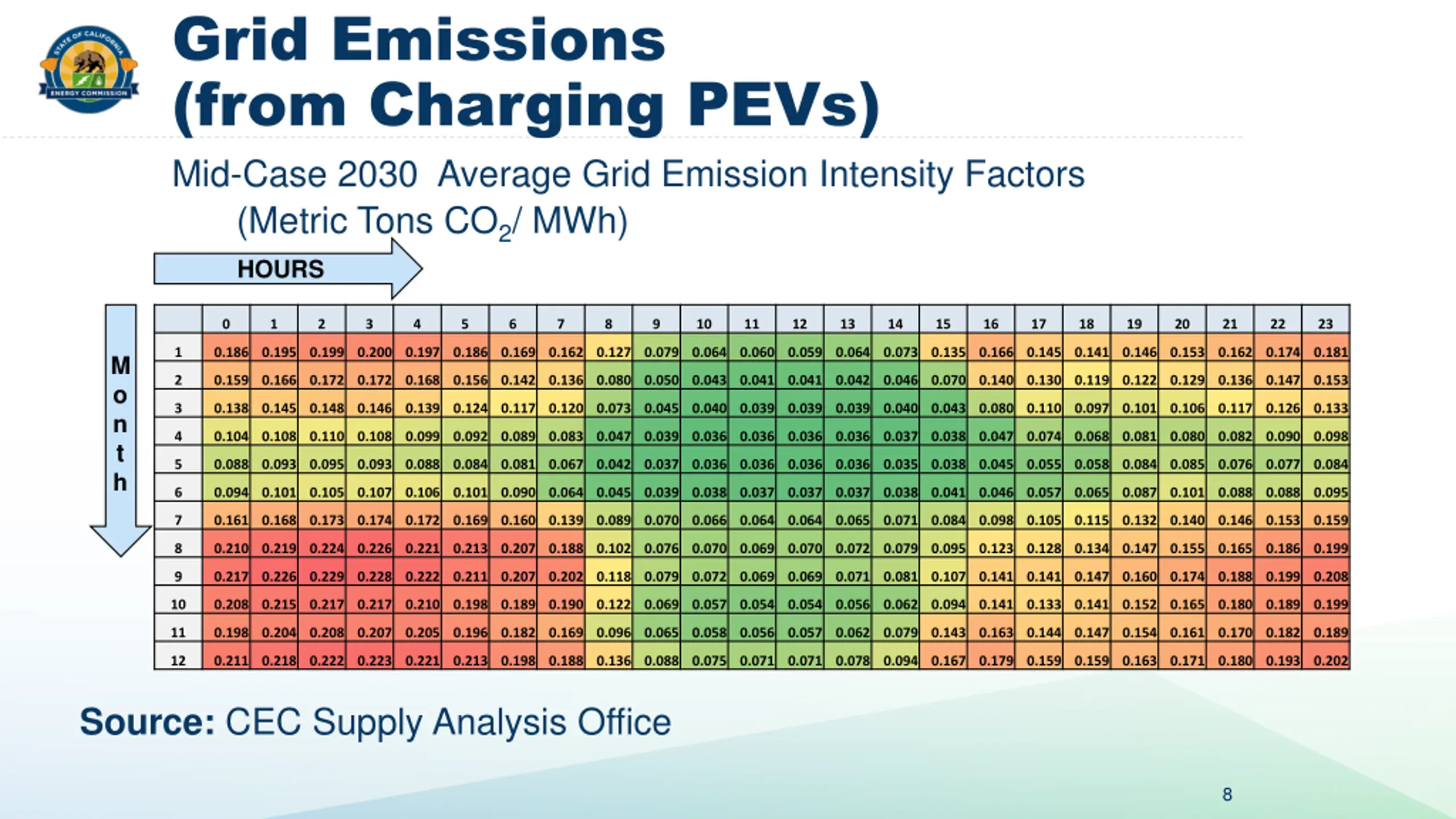 Grid Emissions (from Charging PEVs) Mid-Case 2030 Average Grid Emission Intensity Factors (Metric Tons CO2/ MWh) HOURS 0 1 2 3 4 5 6 7 8 9 10 11 12 13 14 15 16 17 18 19 20 21 22 23 1 0.186 0.195 0.199 0.200 0.197 0.186 0.169 0.162 0.127 0.079 0.064 0.060 0.059 0.064 0.073 0.135 0.166 0.145 0.141 0.146 0.153 0.162 0.174 0.181 M o n t h 2 0.159 0.166 0.172 0.172 0.168 0.156 0.142 0.136 0.080 0.050 0.043 0.041 0.041 0.042 0.046 0.070 0.140 0.130 0.119 0.122 0.129 0.136 0.147 0.153 3 0.138 0.145 0.148 0.146 0.139 0.124 0.117 0.120 0.073 0.045 0.040 0.039 0.039 0.039 0.040 0.043 0.080 0.110 0.097 0.101 0.106 0.117 0.126 0.133 4 0.104 0.108 0.110 0.108 0.099 0.092 0.089 0.083 0.047 0.039 0.036 0.036 0.036 0.036 0.037 0.038 0.047 0.074 0.068 0.081 0.080 0.082 0.090 0.098 5 0.088 0.093 0.095 0.093 0.088 0.084 0.081 0.067 0.042 0.037 0.036 0.036 0.036 0.036 0.035 0.038 0.045 0.055 0.058 0.084 0.085 0.076 0.077 0.084 6 0.094 0.101 0.105 0.107 0.106 0.101 0.090 0.064 0.045 0.039 0.038 0.037 0.037 0.037 0.038 0.041 0.046 0.057 0.065 0.087 0.101 0.088 0.088 0.095 7 0.161 0.168 0.173 0.174 0.172 0.169 0.160 0.139 0.089 0.070 0.066 0.064 0.064 0.065 0.071 0.084 0.098 0.105 0.115 0.132 0.140 0.146 0.153 0.159 8 0.210 0.219 0.224 0.226 0.221 0.213 0.207 0.188 0.102 0.076 0.070 0.069 0.070 0.072 0.079 0.095 0.123 0.128 0.134 0.147 0.155 0.165 0.186 0.199 9 0.217 0.226 0.229 0.228 0.222 0.211 0.207 0.202 0.118 0.079 0.072 0.069 0.069 0.071 0.081 0.107 0.141 0.141 0.147 0.160 0.174 0.188 0.199 0.208 10 0.208 0.215 0.217 0.217 0.210 0.198 0.189 0.190 0.122 0.069 0.057 0.054 0.054 0.056 0.062 0.094 0.141 0.133 0.141 0.152 0.165 0.180 0.189 0.199 11 0.198 0.204 0.208 0.207 0.205 0.196 0.182 0.169 0.096 0.065 0.058 0.056 0.057 0.062 0.079 0.143 0.163 0.144 0.147 0.154 0.161 0.170 0.182 0.189 12 0.211 0.218 0.222 0.223 0.221 0.213 0.198 0.188 0.136 0.088 0.075 0.071 0.071 0.078 0.094 0.167 0.179 0.159 0.159 0.163 0.171 0.180 0.193 0.202 Source: CEC Supply Analysis Office 8