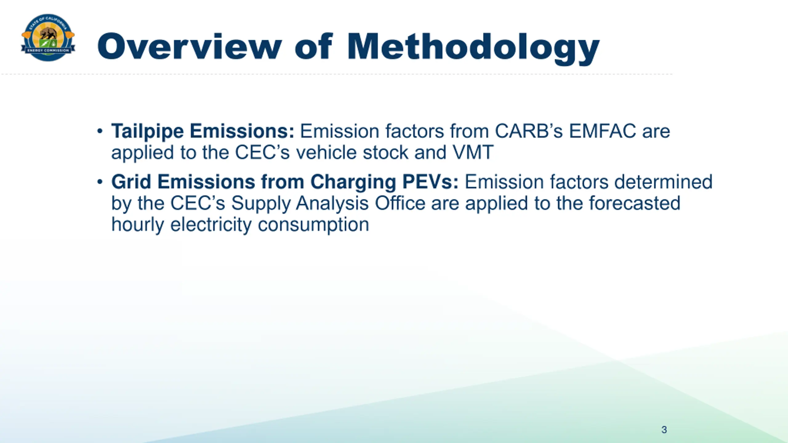 Overview of Methodology Tailpipe Emissions: Emission factors from CARB s EMFAC are applied to the CEC s vehicle stock and VMT Grid Emissions from Charging PEVs: Emission factors determined by the CEC s Supply Analysis Office are applied to the forecasted hourly electricity consumption 3