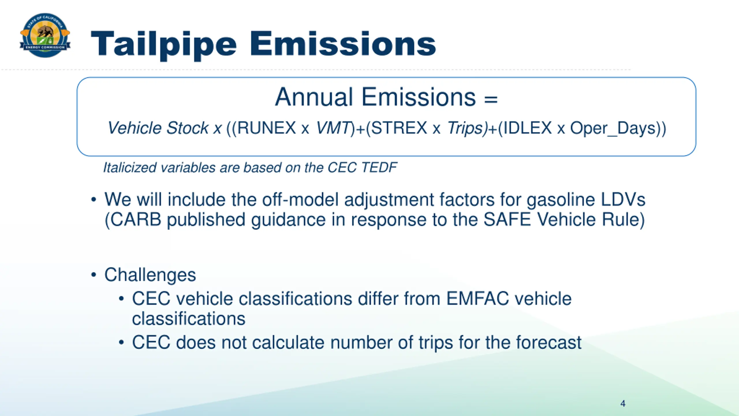 Tailpipe Emissions Annual Emissions = Vehicle Stock x ((RUNEX x VMT)+(STREX x Trips)+(IDLEX x Oper_Days)) Italicized variables are based on the CEC TEDF We will include the off-model adjustment factors for gasoline LDVs (CARB published guidance in response to the SAFE Vehicle Rule) Challenges CEC vehicle classifications differ from EMFAC vehicle classifications CEC does not calculate number of trips for the forecast 4
