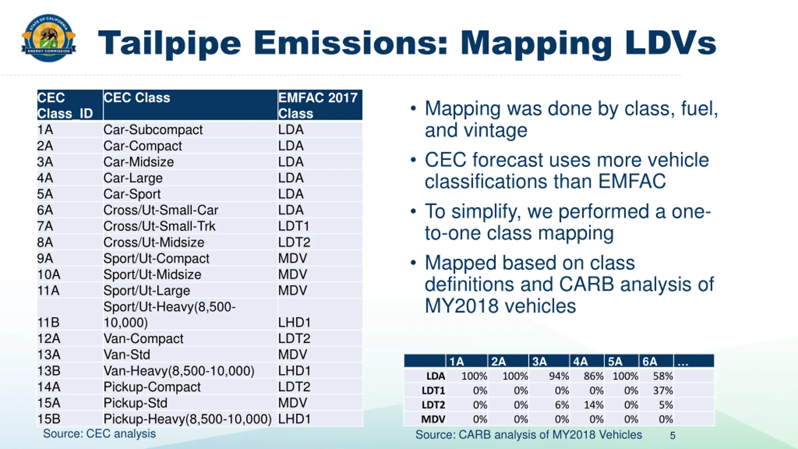 Tailpipe Emissions: Mapping LDVs CEC Class CEC Class_ID 1A 2A 3A 4A 5A 6A 7A 8A 9A 10A 11A EMFAC 2017 Class LDA LDA LDA LDA LDA LDA LDT1 LDT2 MDV MDV MDV Mapping was done by class, fuel, and vintage CEC forecast uses more vehicle classifications than EMFAC To simplify, we performed a one- to-one class mapping Mapped based on class definitions and CARB analysis of MY2018 vehicles Car-Subcompact Car-Compact Car-Midsize Car-Large Car-Sport Cross/Ut-Small-Car Cross/Ut-Small-Trk Cross/Ut-Midsize Sport/Ut-Compact Sport/Ut-Midsize Sport/Ut-Large Sport/Ut-Heavy(8,500- 10,000) Van-Compact Van-Std Van-Heavy(8,500-10,000) Pickup-Compact Pickup-Std Pickup-Heavy(8,500-10,000) LHD1 11B 12A 13A 13B 14A 15A 15B LHD1 LDT2 MDV LHD1 LDT2 MDV 1A 2A 3A 4A 5A 6A LDA LDT1 LDT2 MDV 100% 0% 0% 0% 100% 0% 0% 0% 94% 0% 6% 0% 86% 100% 0% 14% 0% 58% 37% 5% 0% 0% 0% 0% Source: CEC analysis Source: CARB analysis of MY2018 Vehicles 5