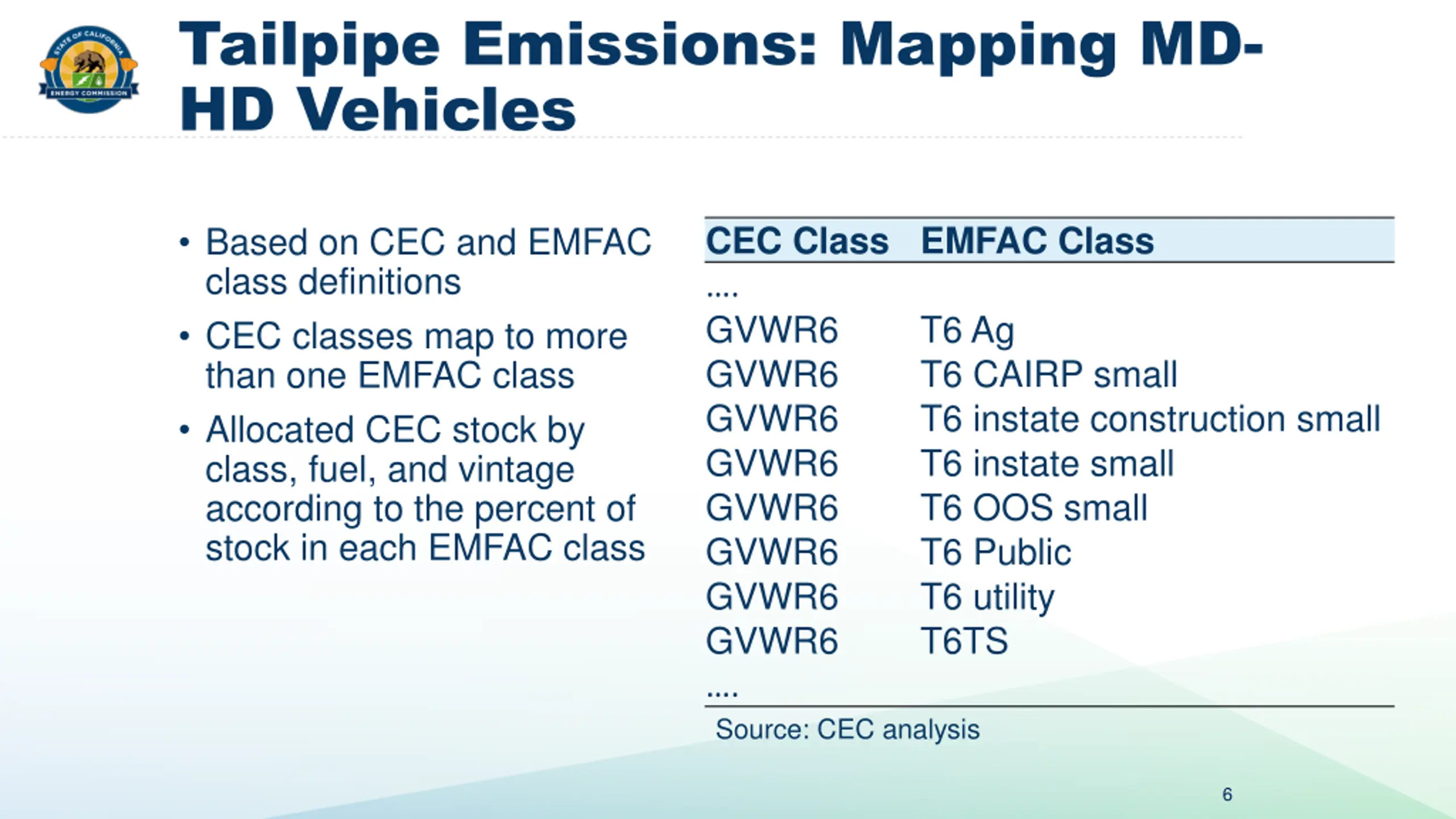 Tailpipe Emissions: Mapping MD- HD Vehicles CEC Class EMFAC Class . GVWR6 T6 Ag GVWR6 T6 CAIRP small GVWR6 T6 instate construction small GVWR6 T6 instate small GVWR6 T6 OOS small GVWR6 T6 Public GVWR6 T6 utility GVWR6 T6TS . Based on CEC and EMFAC class definitions CEC classes map to more than one EMFAC class Allocated CEC stock by class, fuel, and vintage according to the percent of stock in each EMFAC class Source: CEC analysis 6