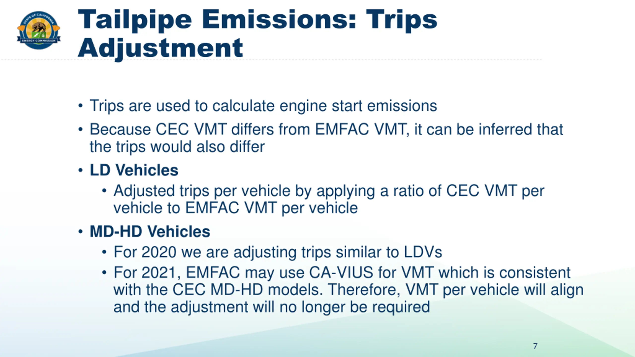 Tailpipe Emissions: Trips Adjustment Trips are used to calculate engine start emissions Because CEC VMT differs from EMFAC VMT, it can be inferred that the trips would also differ LD Vehicles Adjusted trips per vehicle by applying a ratio of CEC VMT per vehicle to EMFAC VMT per vehicle MD-HDVehicles For 2020 we are adjusting trips similar to LDVs For 2021, EMFAC may use CA-VIUS for VMT which is consistent with the CEC MD-HD models. Therefore, VMT per vehicle will align and the adjustment will no longer be required 7