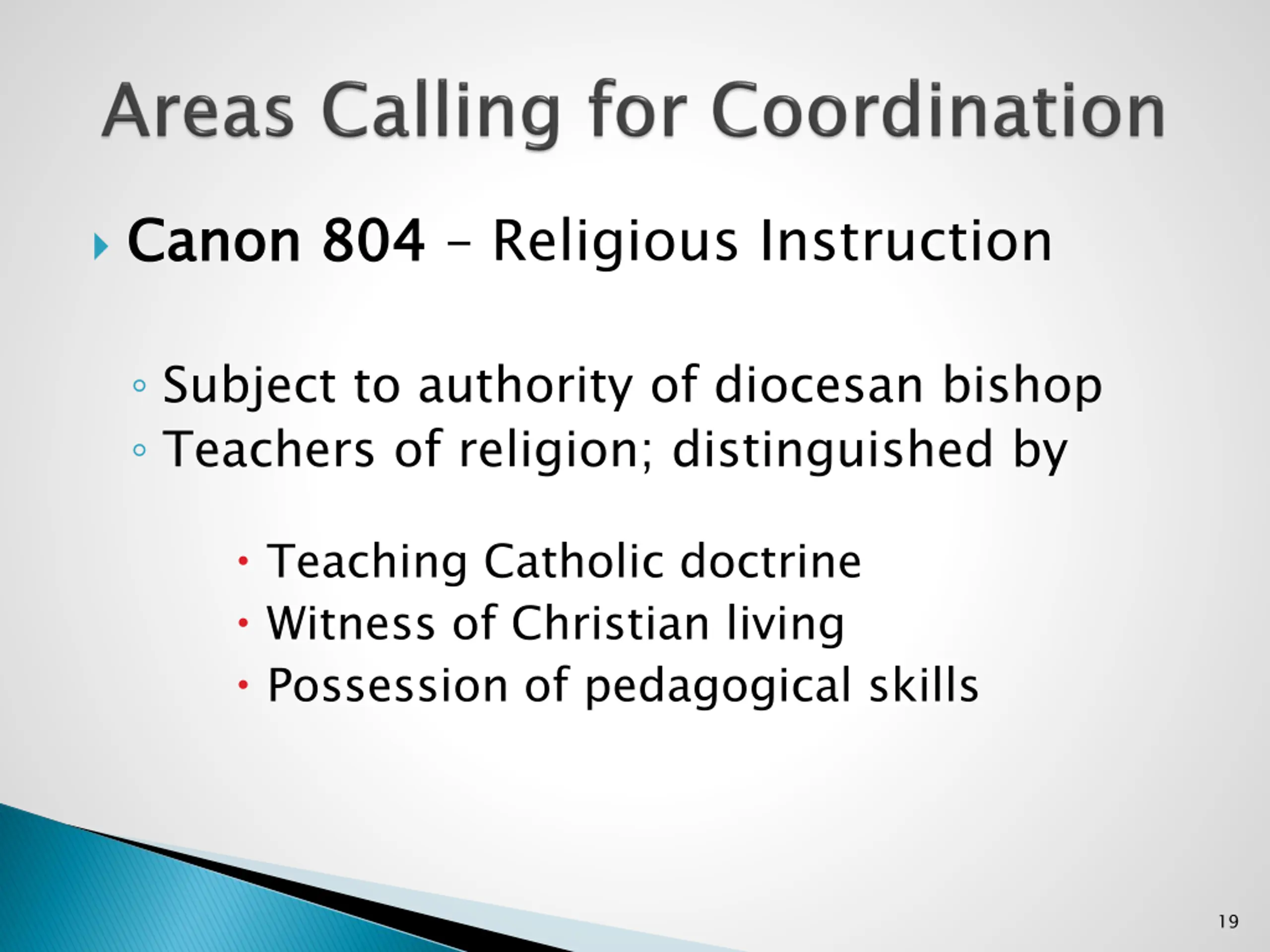Canon 804 Canon 804 Religious Instruction Subject to authority of diocesan bishop Teachers of religion; distinguished by Teaching Catholic doctrine Witness of Christian living Possession of pedagogical skills 19
