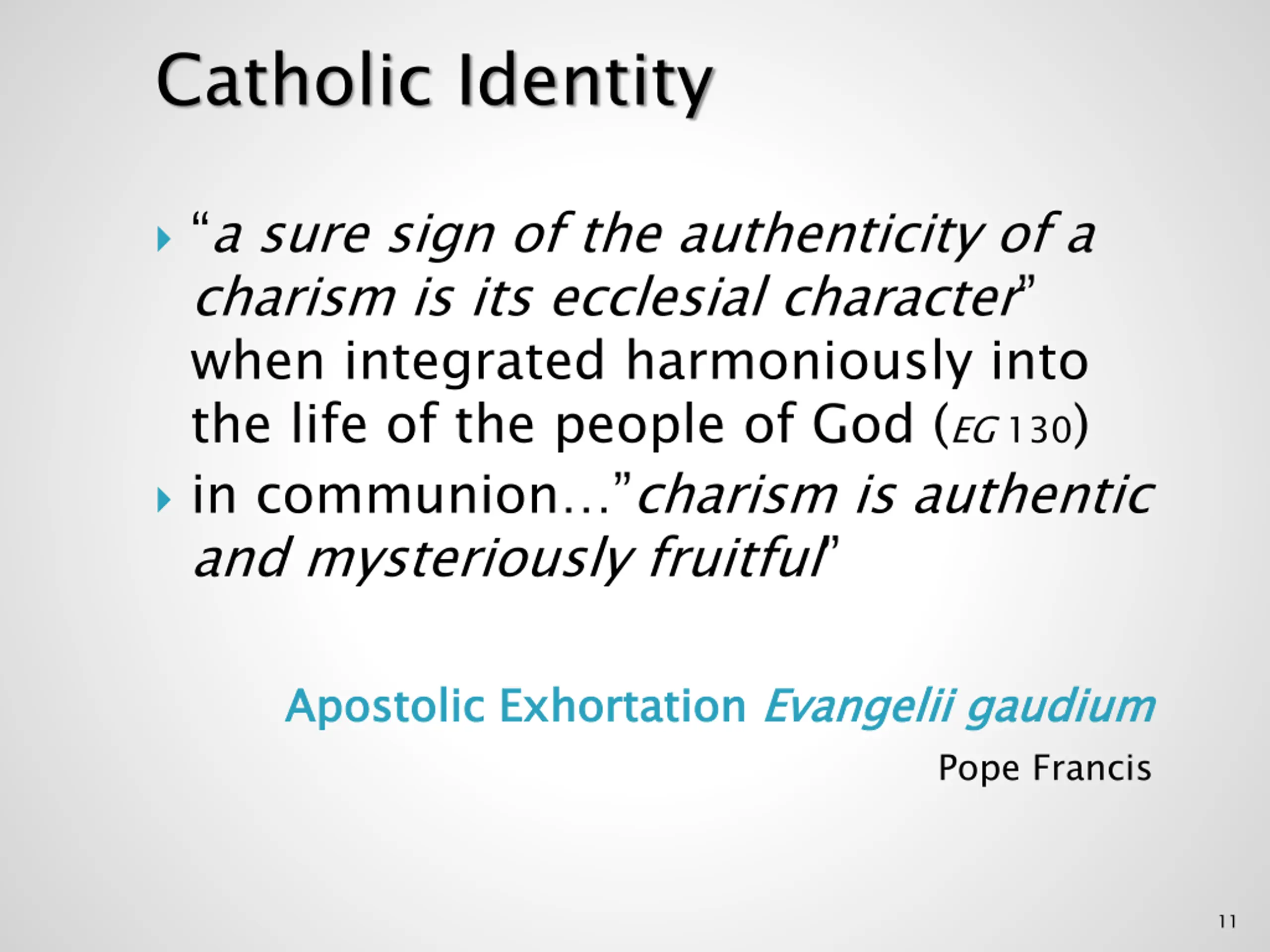 Catholic Identity a sure sign of the authenticity of a charism is its ecclesial character when integrated harmoniously into the life of the people of God (EG 130) in communion charism is authentic and mysteriously fruitful Apostolic Exhortation Apostolic Exhortation Evangelii Evangelii gaudium Pope Francis gaudium 11