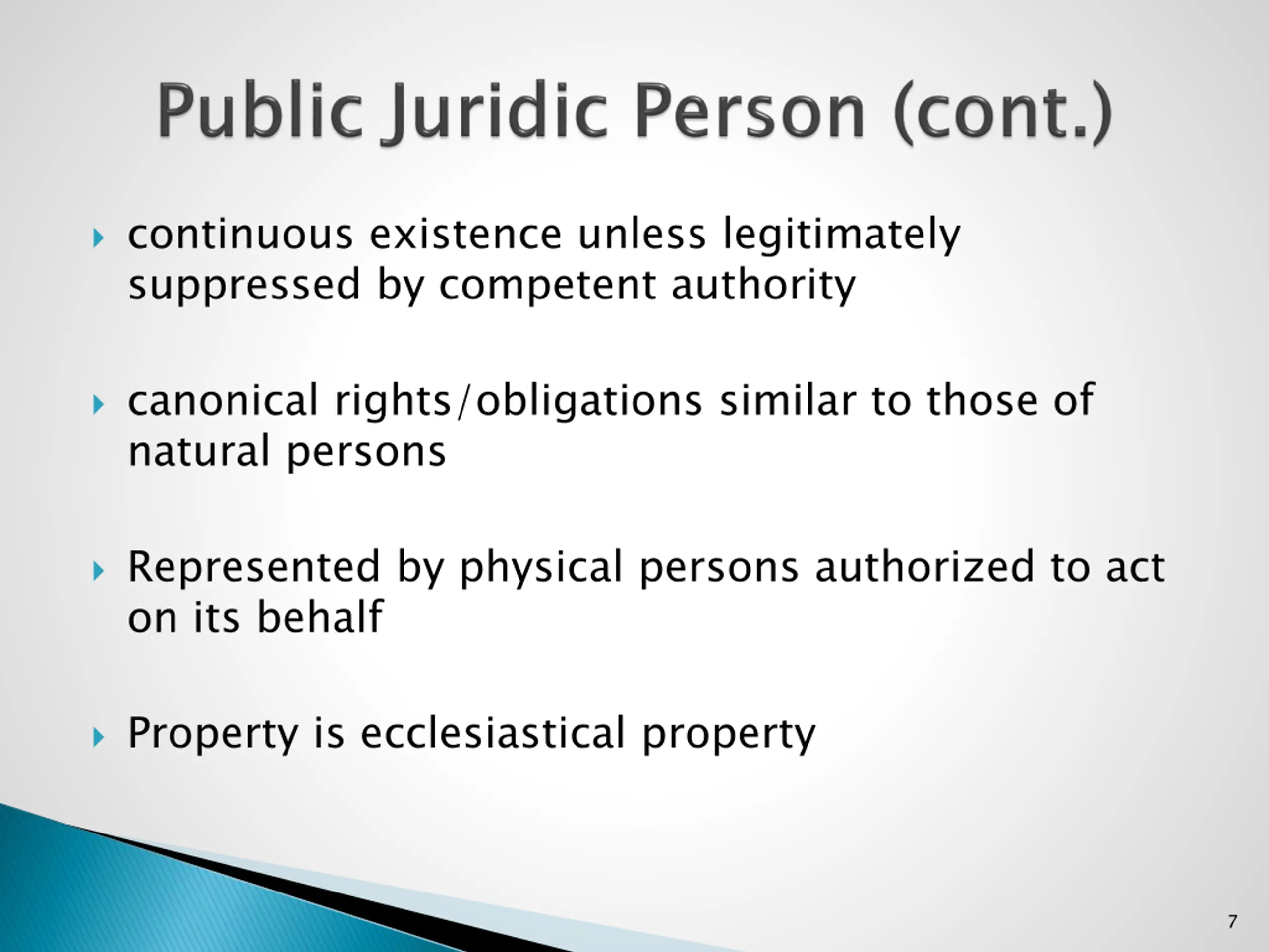 continuous existence unless legitimately suppressed by competent authority canonical rights/obligations similar to those of natural persons Represented by physical persons authorized to act on its behalf Property is ecclesiastical property 7