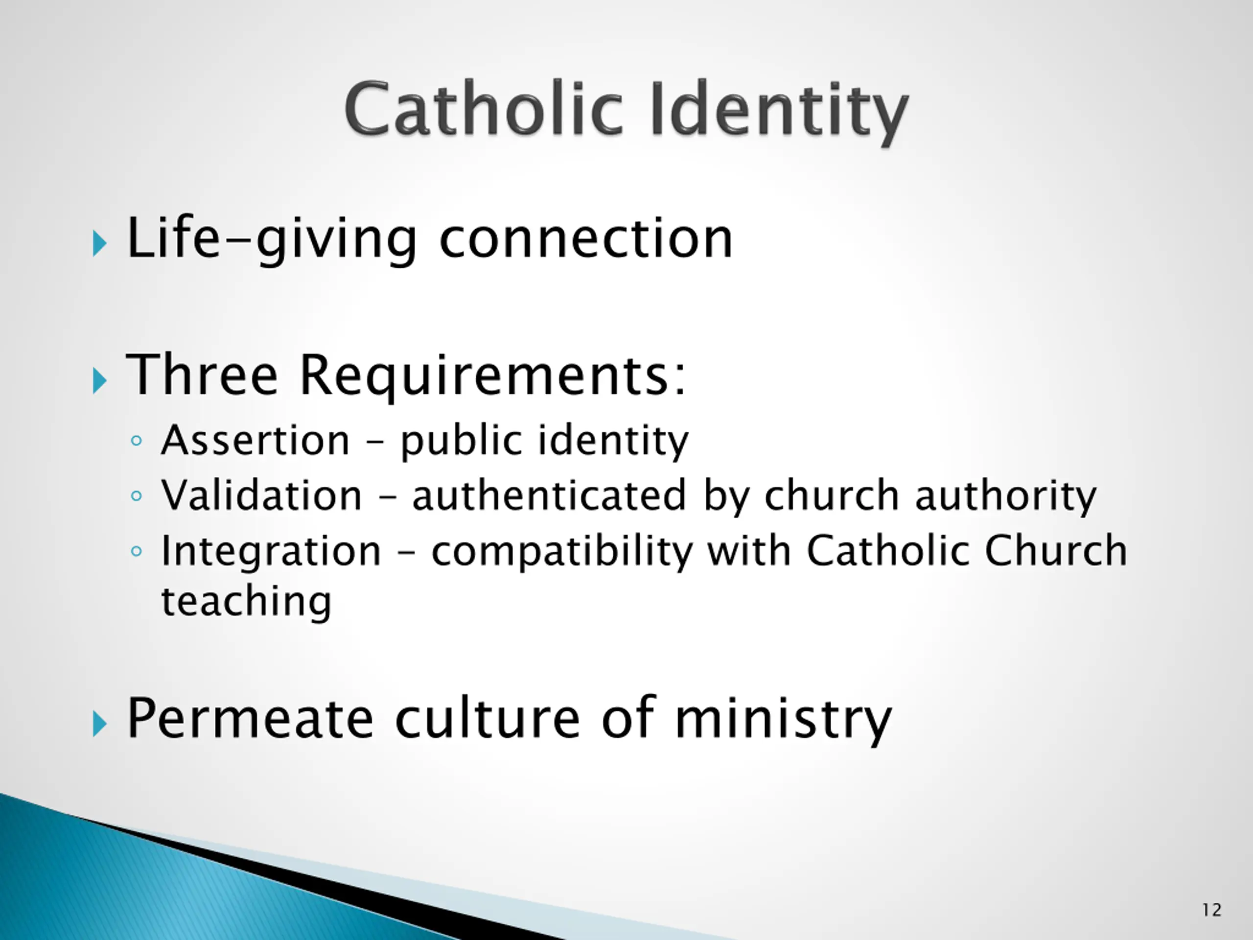 Life-giving connection Three Requirements: Assertion public identity Validation authenticated by church authority Integration compatibility with Catholic Church teaching Permeate culture of ministry 12