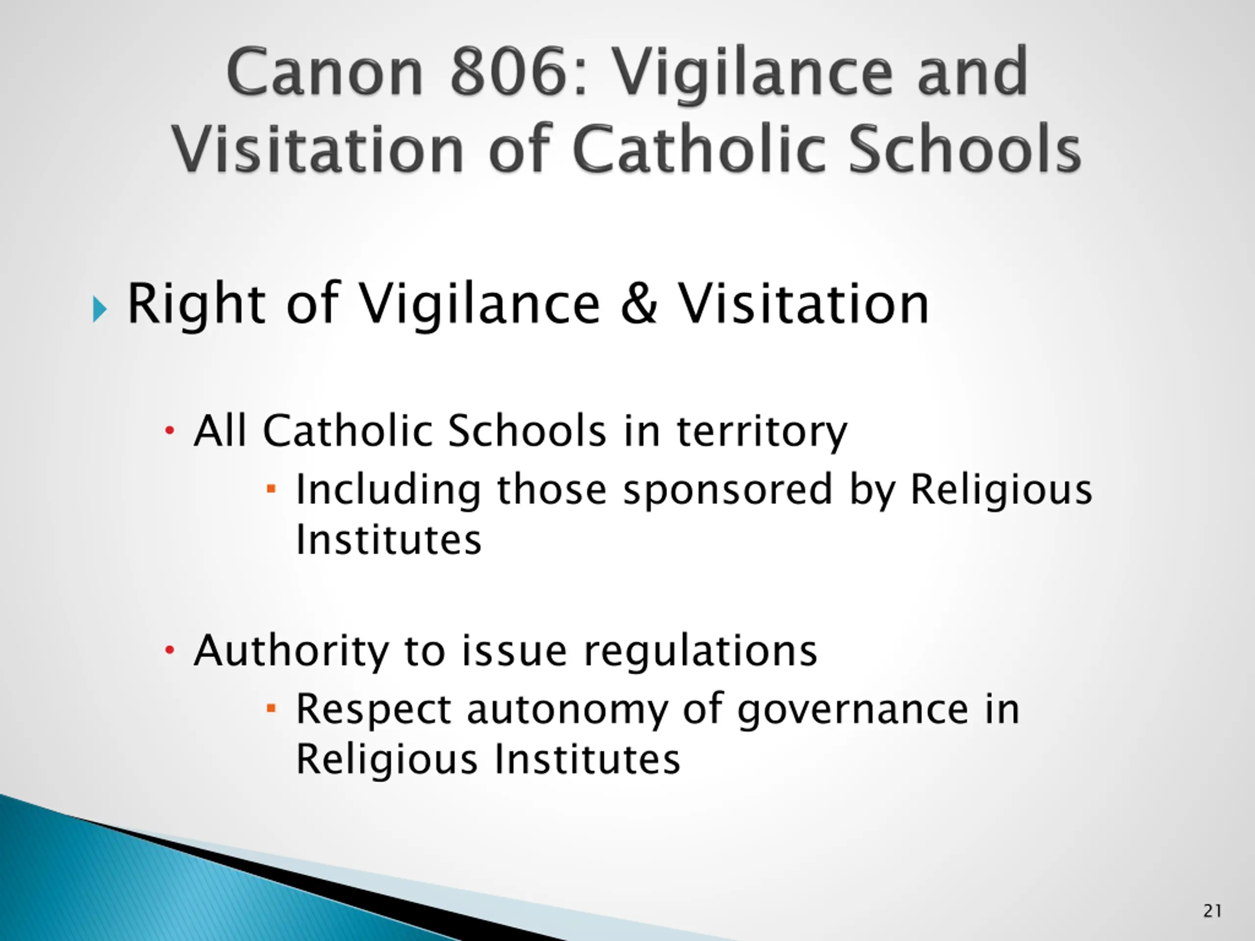 Right of Vigilance & Visitation All Catholic Schools in territory Including those sponsored by Religious Institutes Authority to issue regulations Respect autonomy of governance in Religious Institutes 21