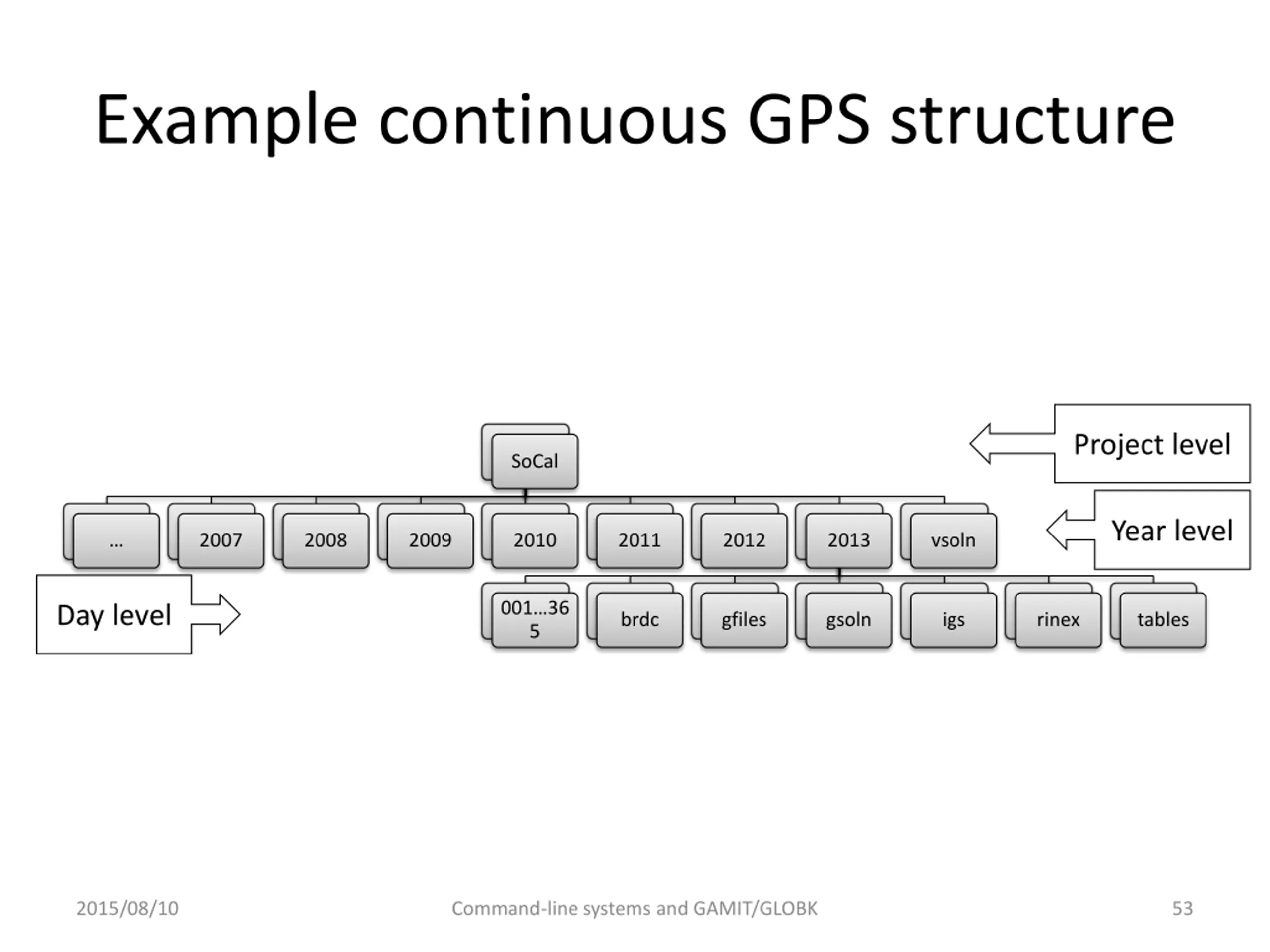 Example continuous GPS structure Project level SoCal Year level 2007 2008 2009 2010 2011 2012 2013 vsoln 001 36 5 Day level brdc gfiles gsoln igs rinex tables 2015/08/10 Command-line systems and GAMIT/GLOBK 53