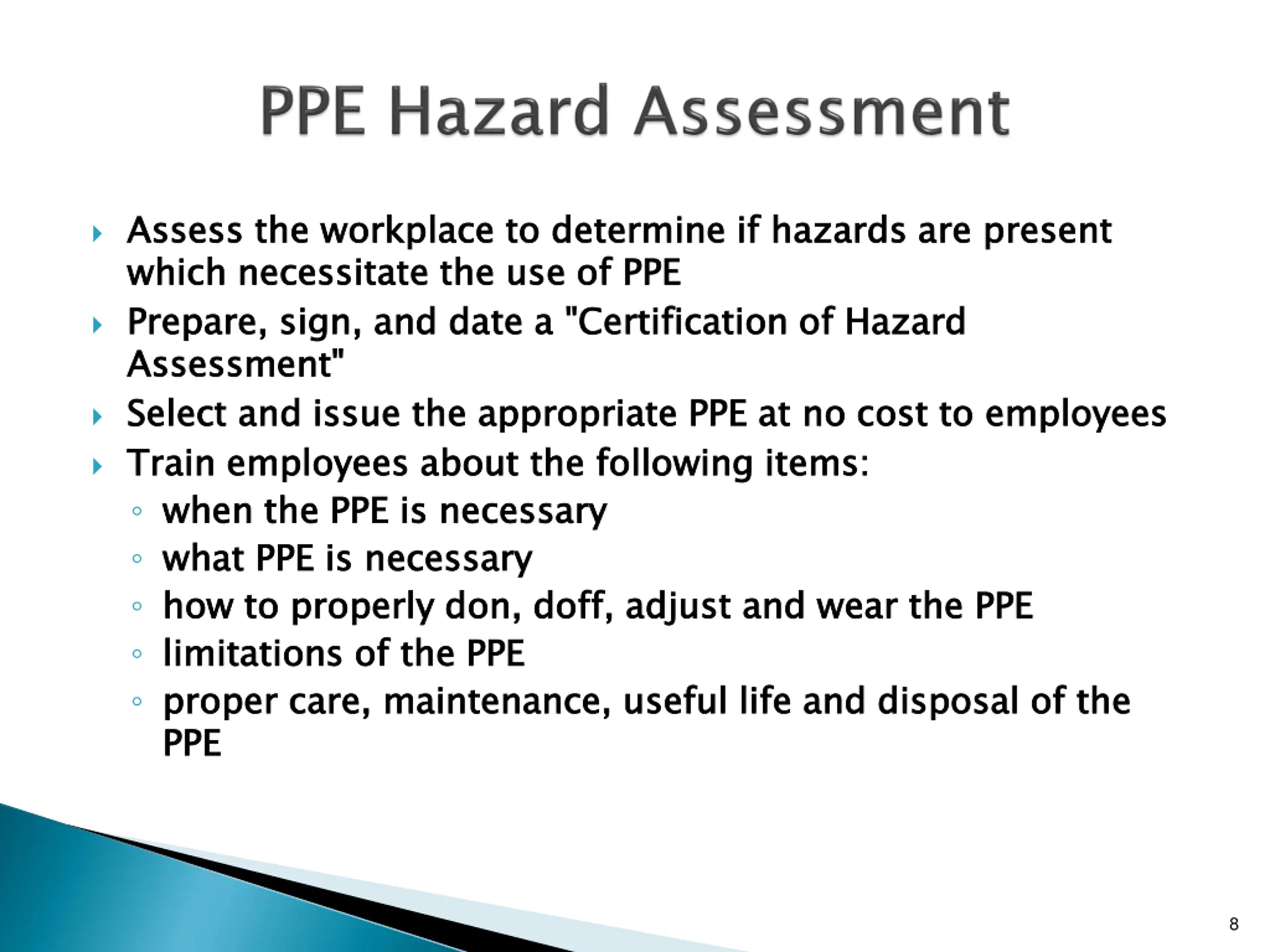 Assess the workplace to determine if hazards are present which necessitate the use of PPE Prepare, sign, and date a "Certification of Hazard Assessment" Select and issue the appropriate PPE at no cost to employees Train employees about the following items: when the PPE is necessary what PPE is necessary how to properly don, doff, adjust and wear the PPE limitations of the PPE proper care, maintenance, useful life and disposal of the PPE Assess the workplace to determine if hazards are present which necessitate the use of PPE Prepare, sign, and date a "Certification of Hazard Assessment" Select and issue the appropriate PPE at no cost to employees Train employees about the following items: when the PPE is necessary what PPE is necessary how to properly don, doff, adjust and wear the PPE limitations of the PPE proper care, maintenance, useful life and disposal of the PPE 8