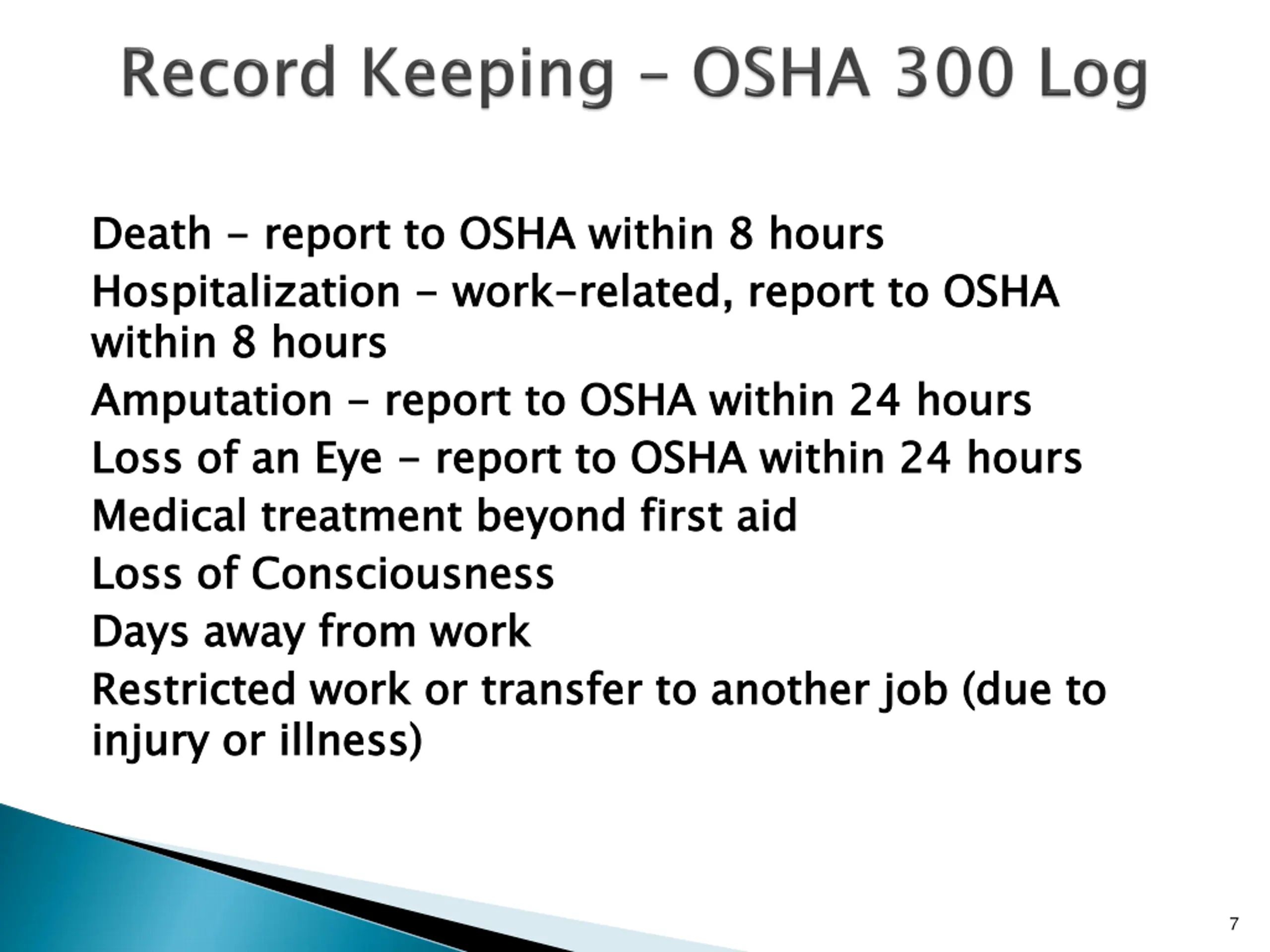 Death Hospitalization within 8 hours Amputation Loss of an Eye Medical treatment beyond first aid Loss of Consciousness Days away from work Restricted work or transfer to another job (due to injury or illness) Death - - report to OSHA within 8 hours Hospitalization - - work within 8 hours Amputation - - report to OSHA within 24 hours Loss of an Eye - - report to OSHA within 24 hours Medical treatment beyond first aid Loss of Consciousness Days away from work Restricted work or transfer to another job (due to injury or illness) report to OSHA within 8 hours work- -related, report to OSHA related, report to OSHA report to OSHA within 24 hours report to OSHA within 24 hours 7