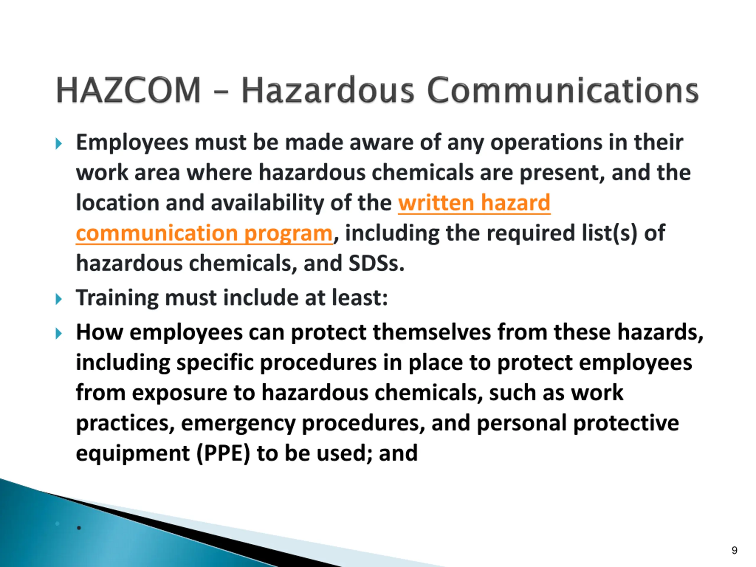 Employees must be made aware of any operations in their work area where hazardous chemicals are present, and the location and availability of the written hazard communication program, including the required list(s) of hazardous chemicals, and SDSs. Training must include at least: How employees can protect themselves from these hazards, including specific procedures in place to protect employees from exposure to hazardous chemicals, such as work practices, emergency procedures, and personal protective equipment (PPE) to be used; and . 9