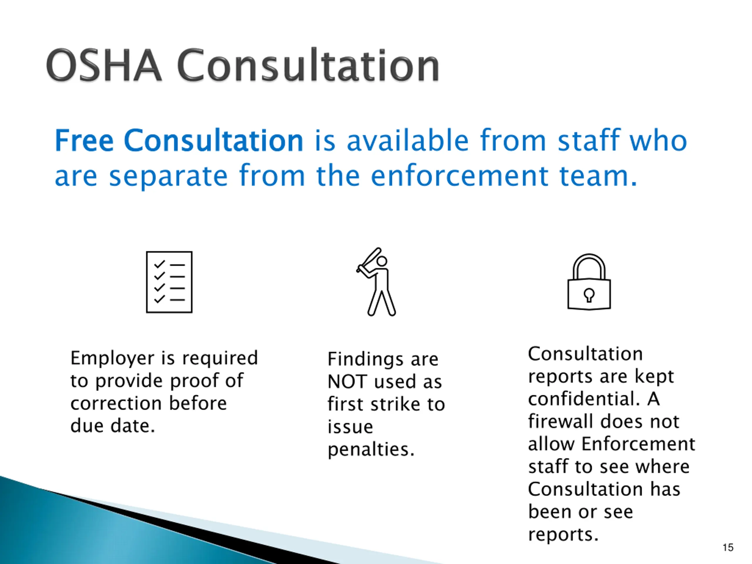 Free Consultation are separate from the enforcement team. Free Consultation is available from staff who Consultation reports are kept confidential. A firewall does not allow Enforcement staff to see where Consultation has been or see reports. Employer is required to provide proof of correction before due date. Findings are NOT used as first strike to issue penalties. 15