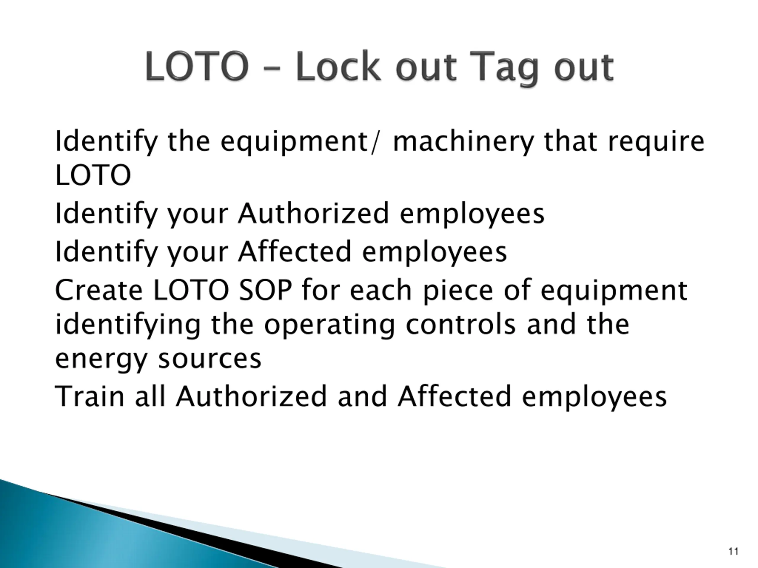 Identify the equipment/ machinery that require LOTO Identify your Authorized employees Identify your Affected employees Create LOTO SOP for each piece of equipment identifying the operating controls and the energy sources Train all Authorized and Affected employees 11
