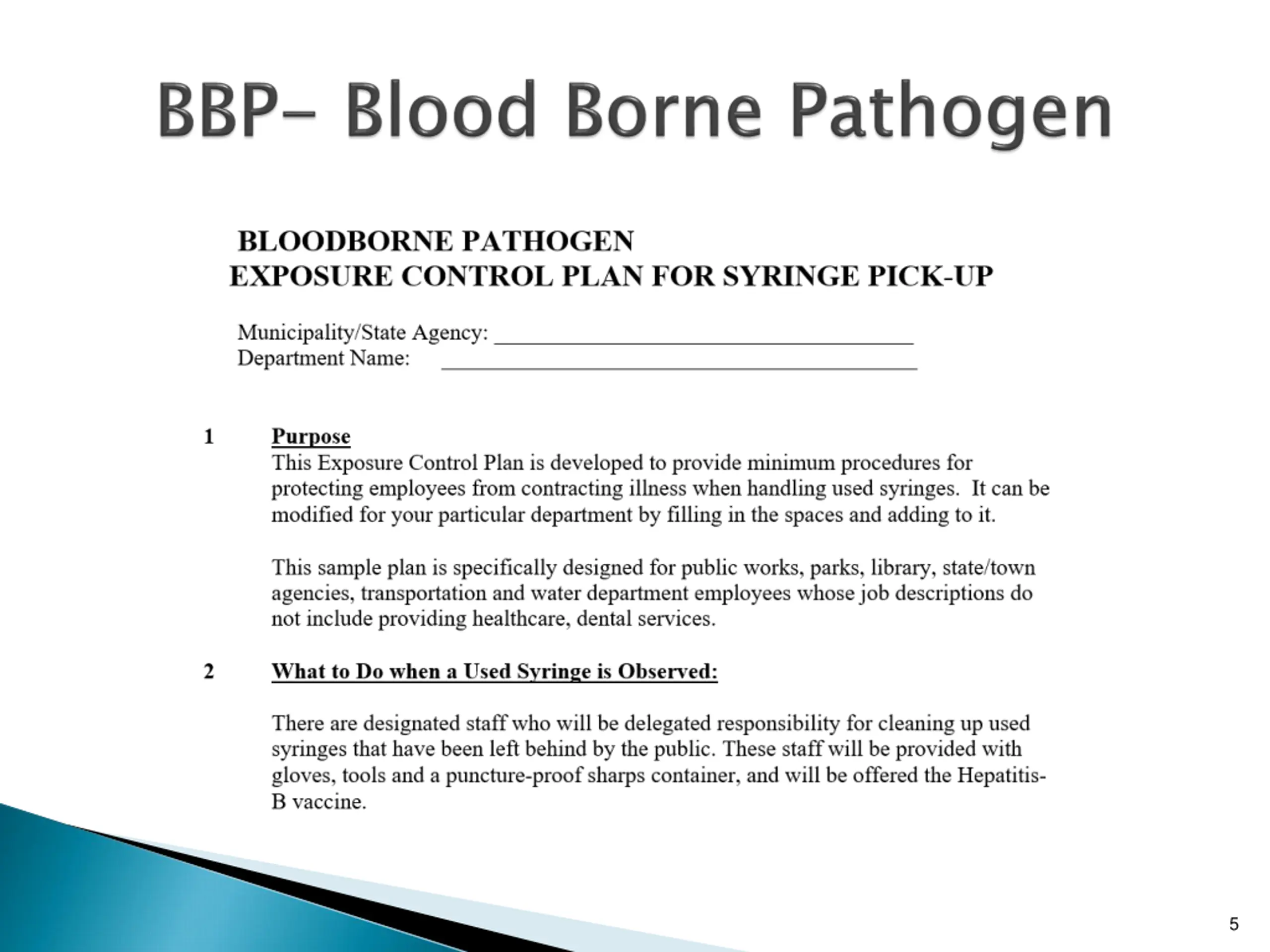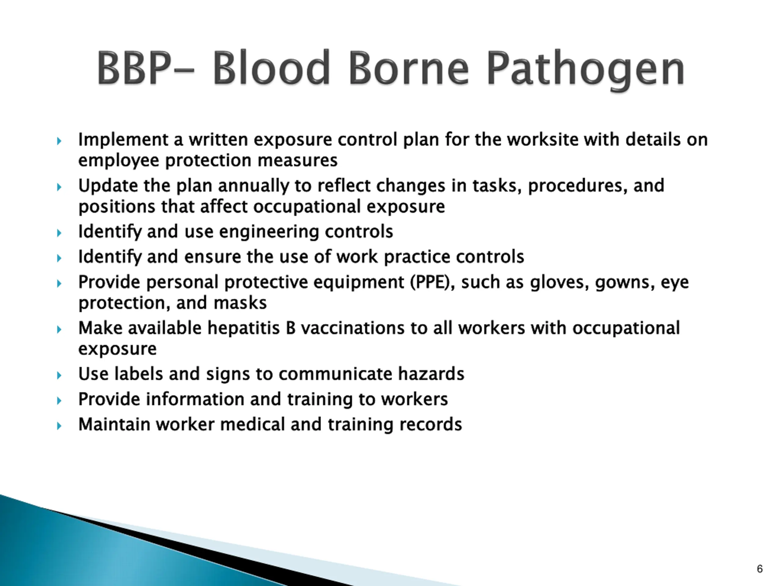 Implement a written exposure control plan for the worksite with details on employee protection measures Update the plan annually to reflect changes in tasks, procedures, and positions that affect occupational exposure Identify and use engineering controls Identify and ensure the use of work practice controls Provide protection, and masks Make available hepatitis B vaccinations to all workers with occupational exposure Use labels and signs to communicate hazards Provide information and training to workers Maintain worker medical and training records Implement a written exposure control plan for the worksite with details on employee protection measures Update the plan annually to reflect changes in tasks, procedures, and positions that affect occupational exposure Identify and use engineering controls Identify and ensure the use of work practice controls Provide personal protective equipment (PPE), such as gloves, gowns, eye protection, and masks Make available hepatitis B vaccinations to all workers with occupational exposure Use labels and signs to communicate hazards Provide information and training to workers Maintain worker medical and training records personal protective equipment (PPE), such as gloves, gowns, eye 6
