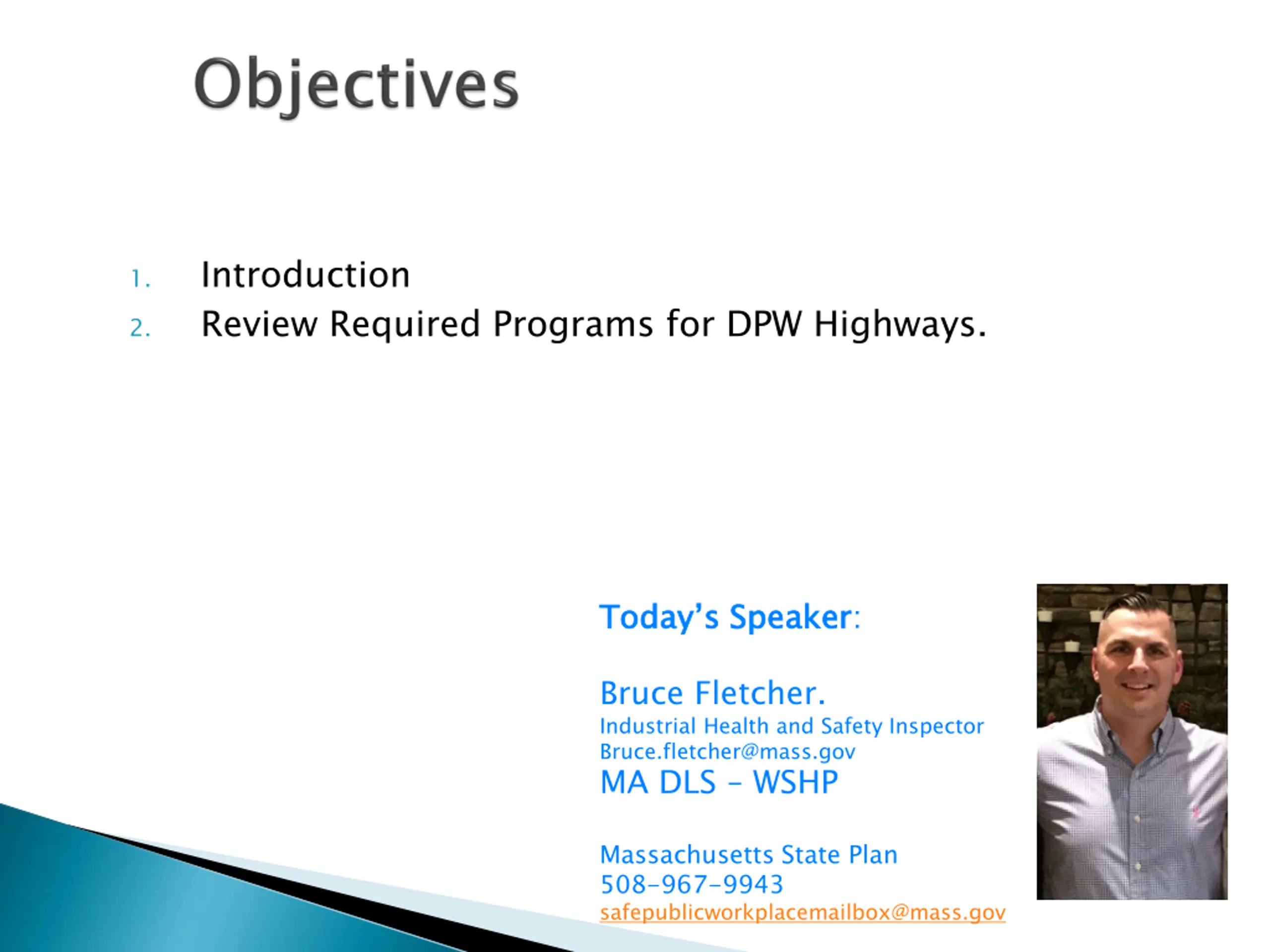 Introduction Review Required Programs for DPW Highways. 1. 2. Today s Speaker Today s Speaker: Bruce Fletcher. Industrial Health and Safety Inspector Bruce.fletcher@mass.gov MA DLS WSHP Massachusetts State Plan 508-967-9943 safepublicworkplacemailbox@mass.gov