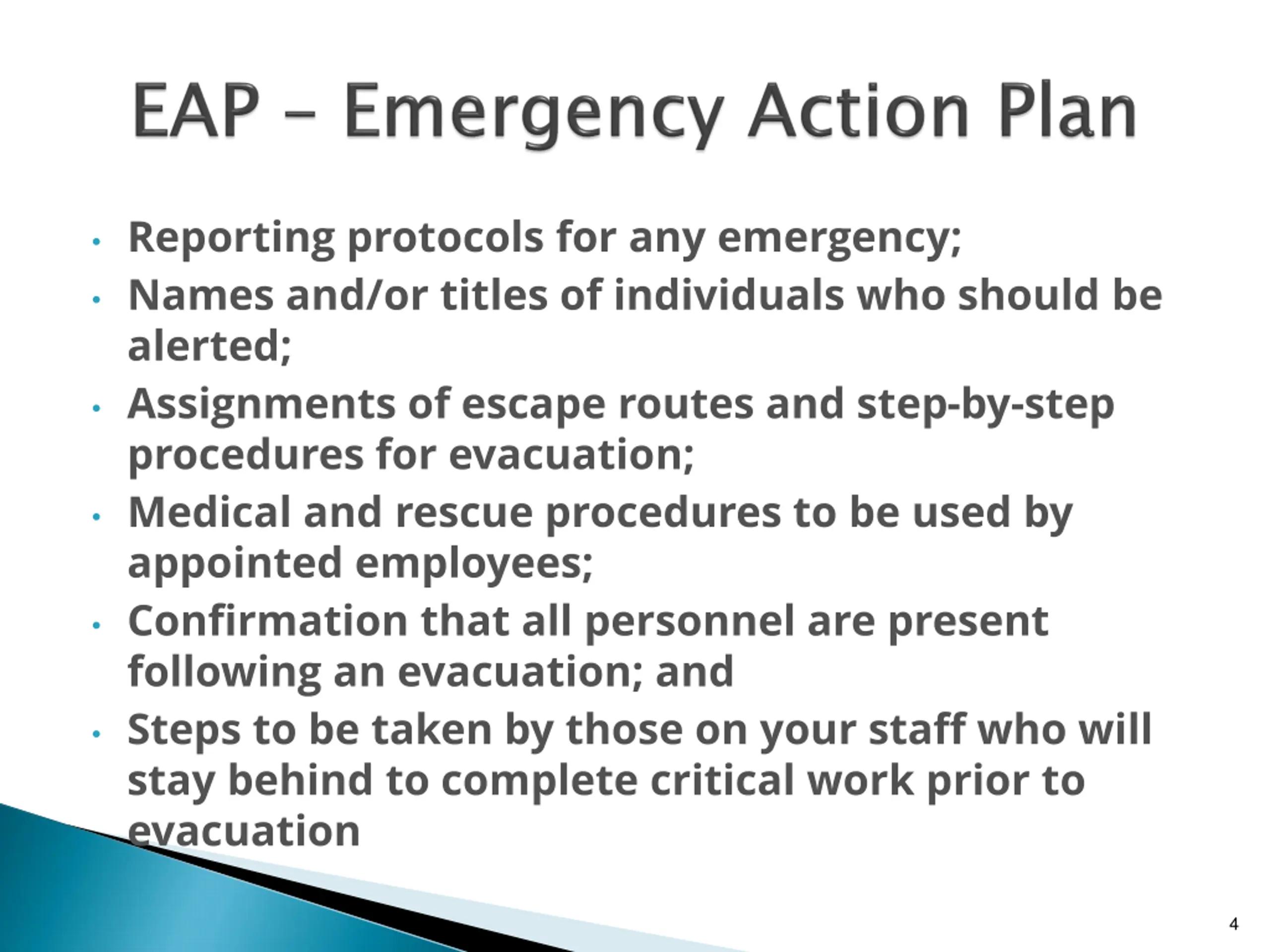 Reporting protocols for any emergency; Names and/or titles of individuals who should be alerted; Assignments of escape routes and step-by-step procedures for evacuation; Medical and rescue procedures to be used by appointed employees; Confirmation that all personnel are present following an evacuation; and Steps to be taken by those on your staff who will stay behind to complete critical work prior to evacuation 4