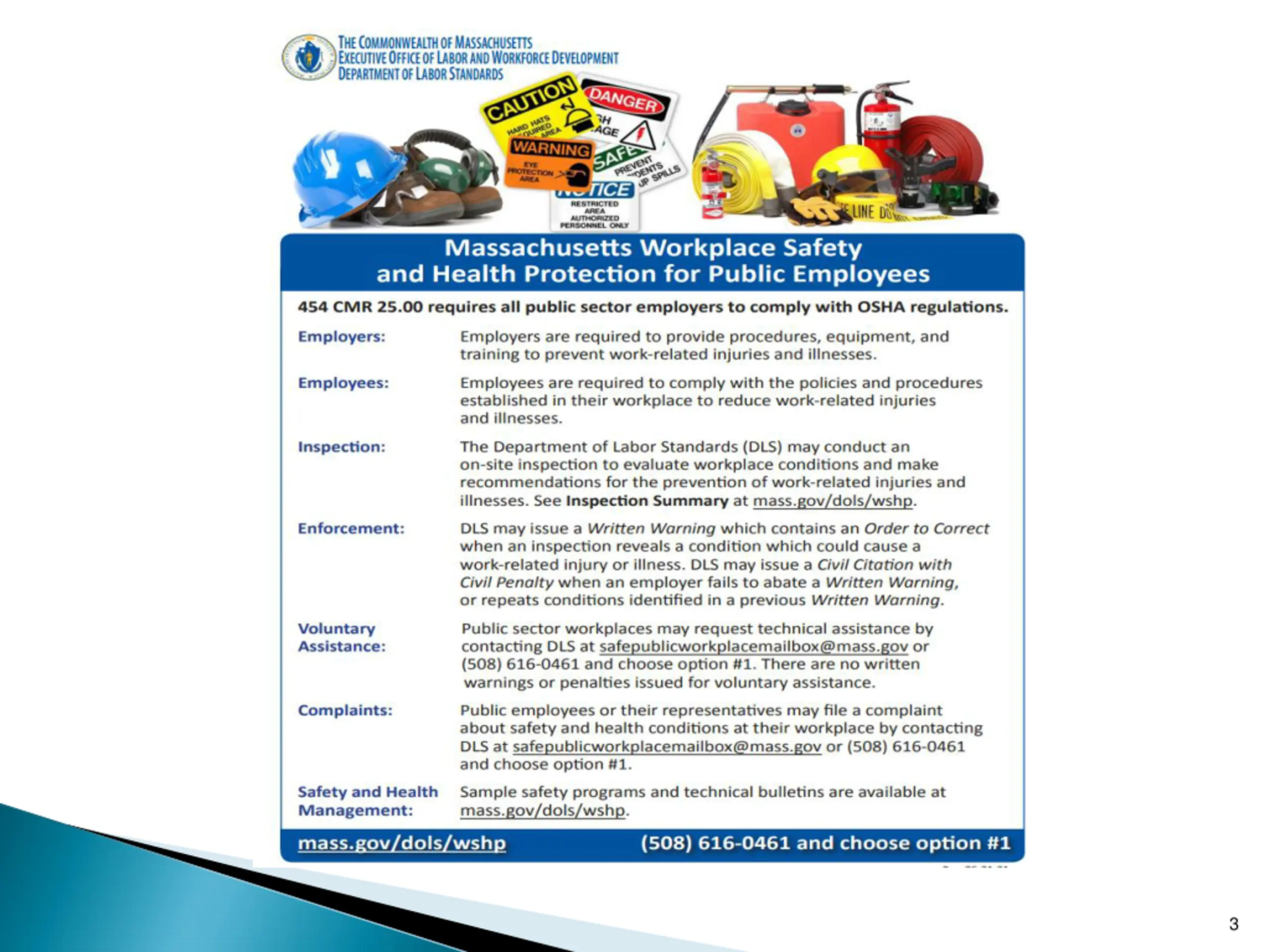 Workplace Safety and Health Program Workplace Safety and Health Program Phone: 508-616-0461 x1 Email: safepublicworkplacemailbox@mass.gov Website: www.mass.gov/dols/wshp 16