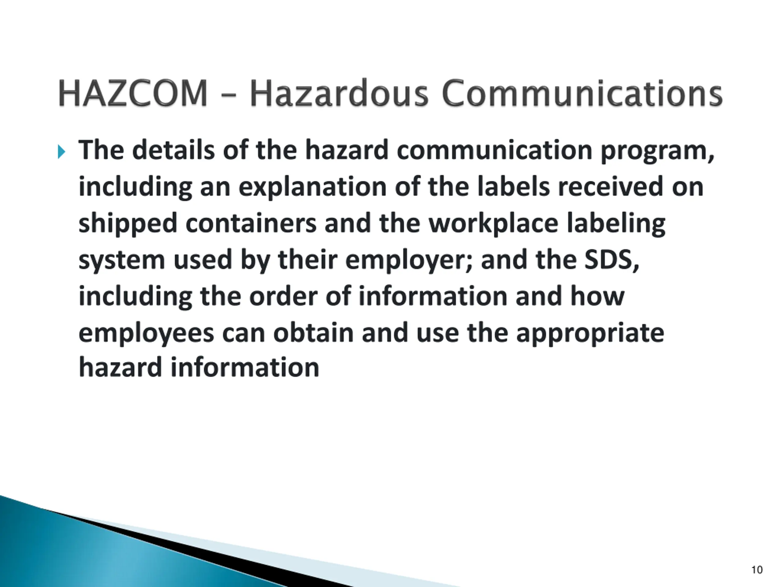 The details of the hazard communication program, including an explanation of the labels received on shipped containers and the workplace labeling system used by their employer; and the SDS, including the order of information and how employees can obtain and use the appropriate hazard information 10