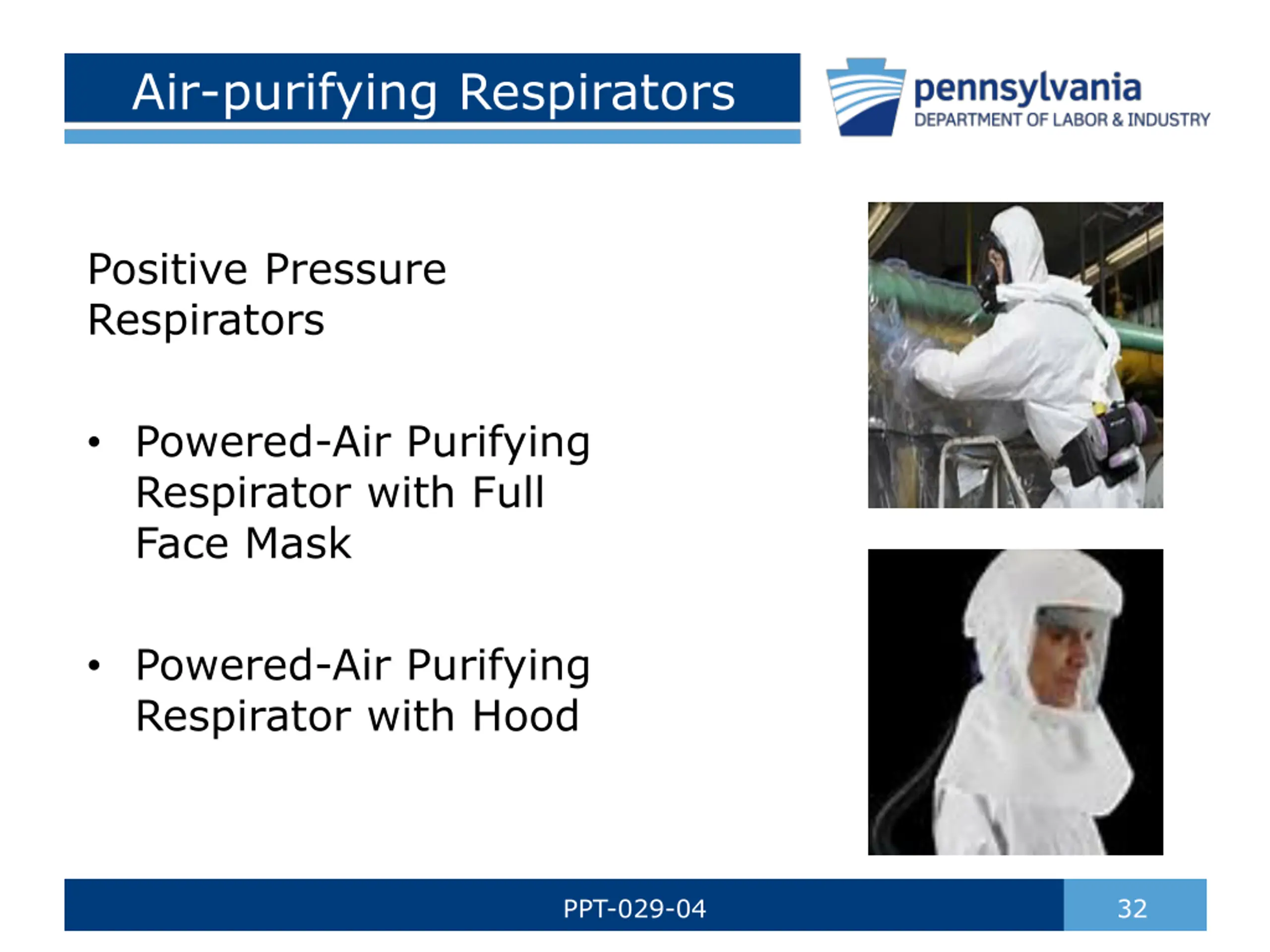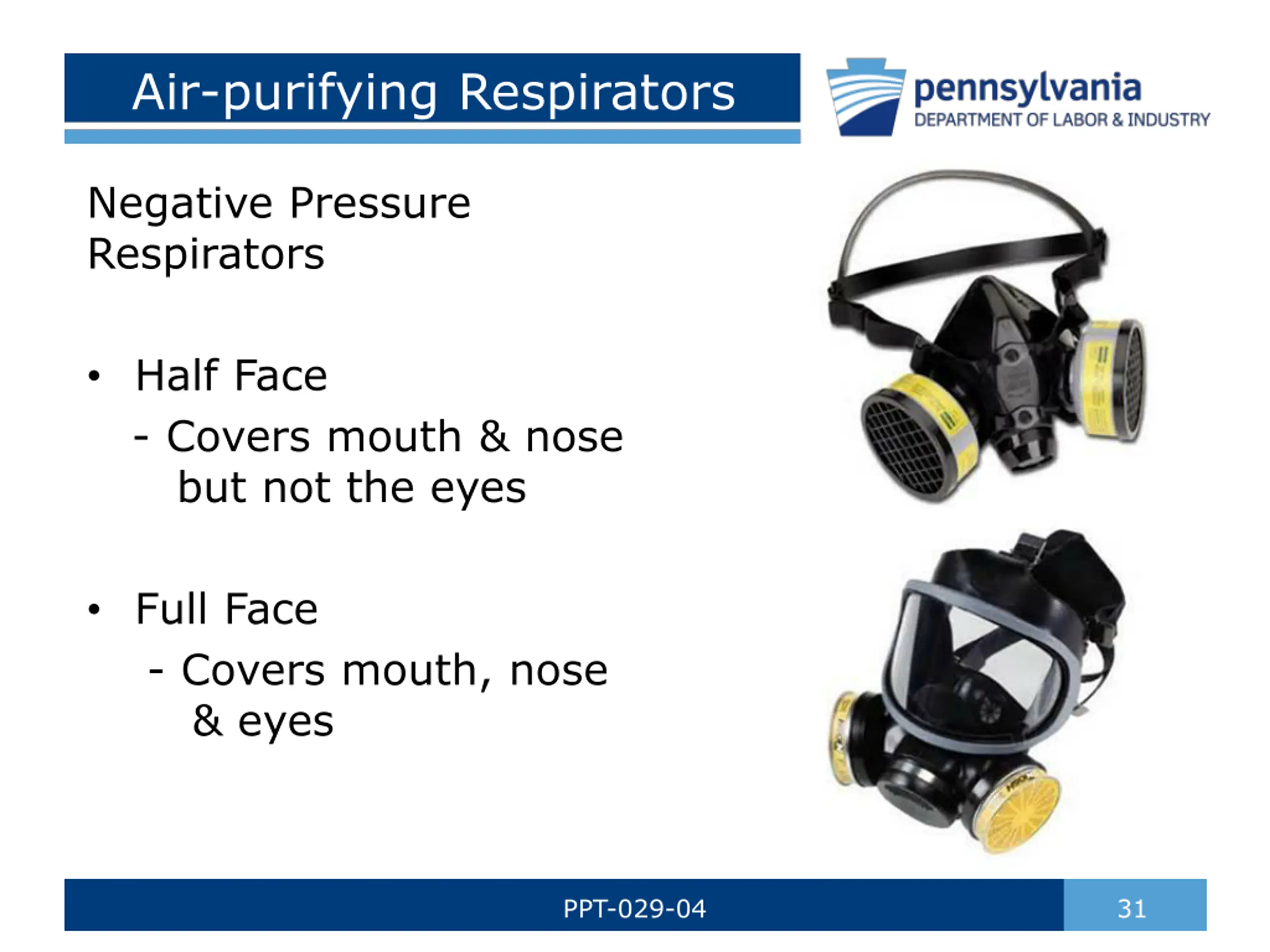 Air-purifying Respirators Negative Pressure Respirators Half Face - Covers mouth & nose but not the eyes Full Face - Covers mouth, nose & eyes PPT-029-04 31