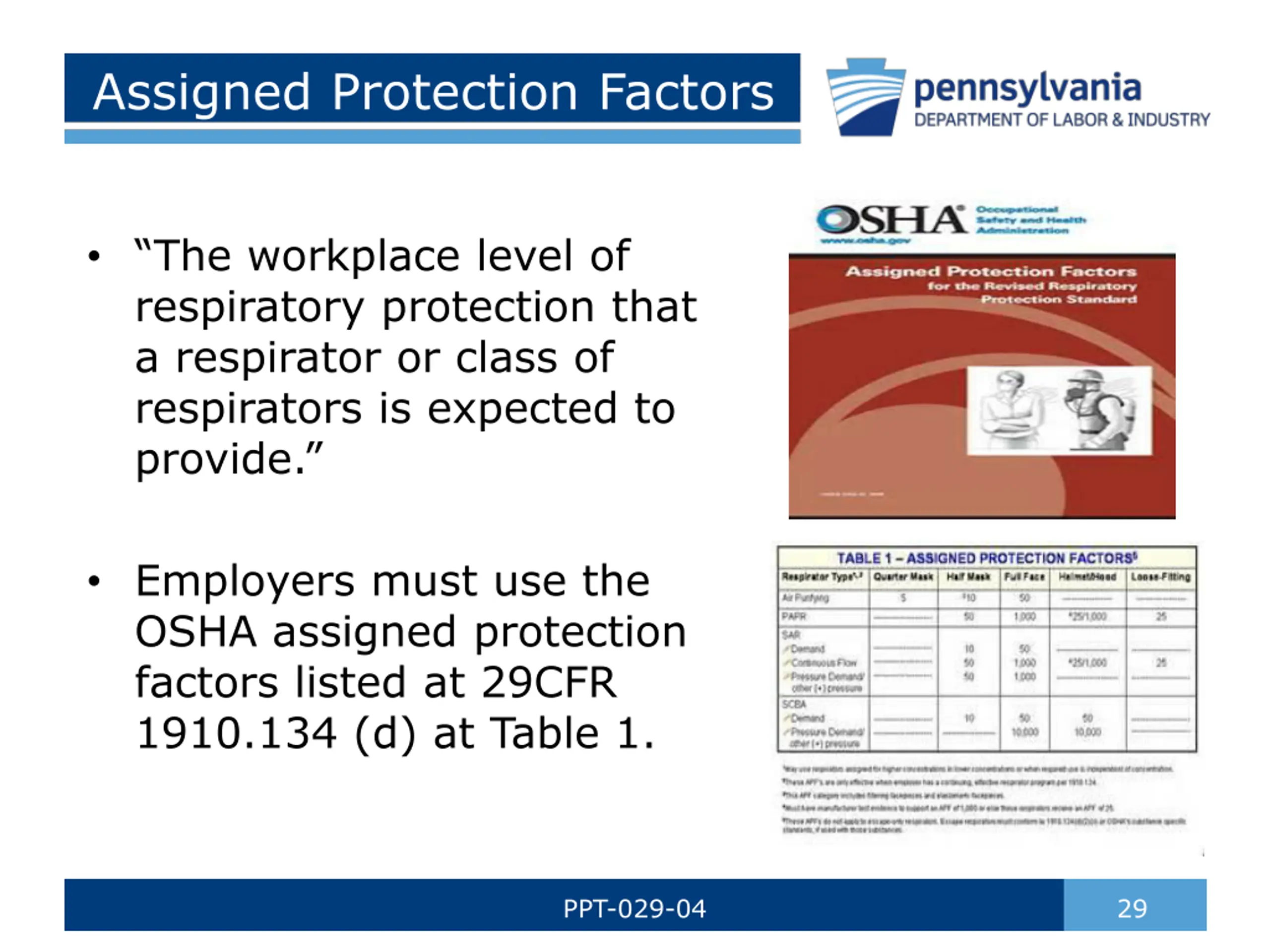 Assigned Protection Factors The workplace level of respiratory protection that a respirator or class of respirators is expected to provide. Employers must use the OSHA assigned protection factors listed at 29CFR 1910.134 (d) at Table 1. PPT-029-04 29