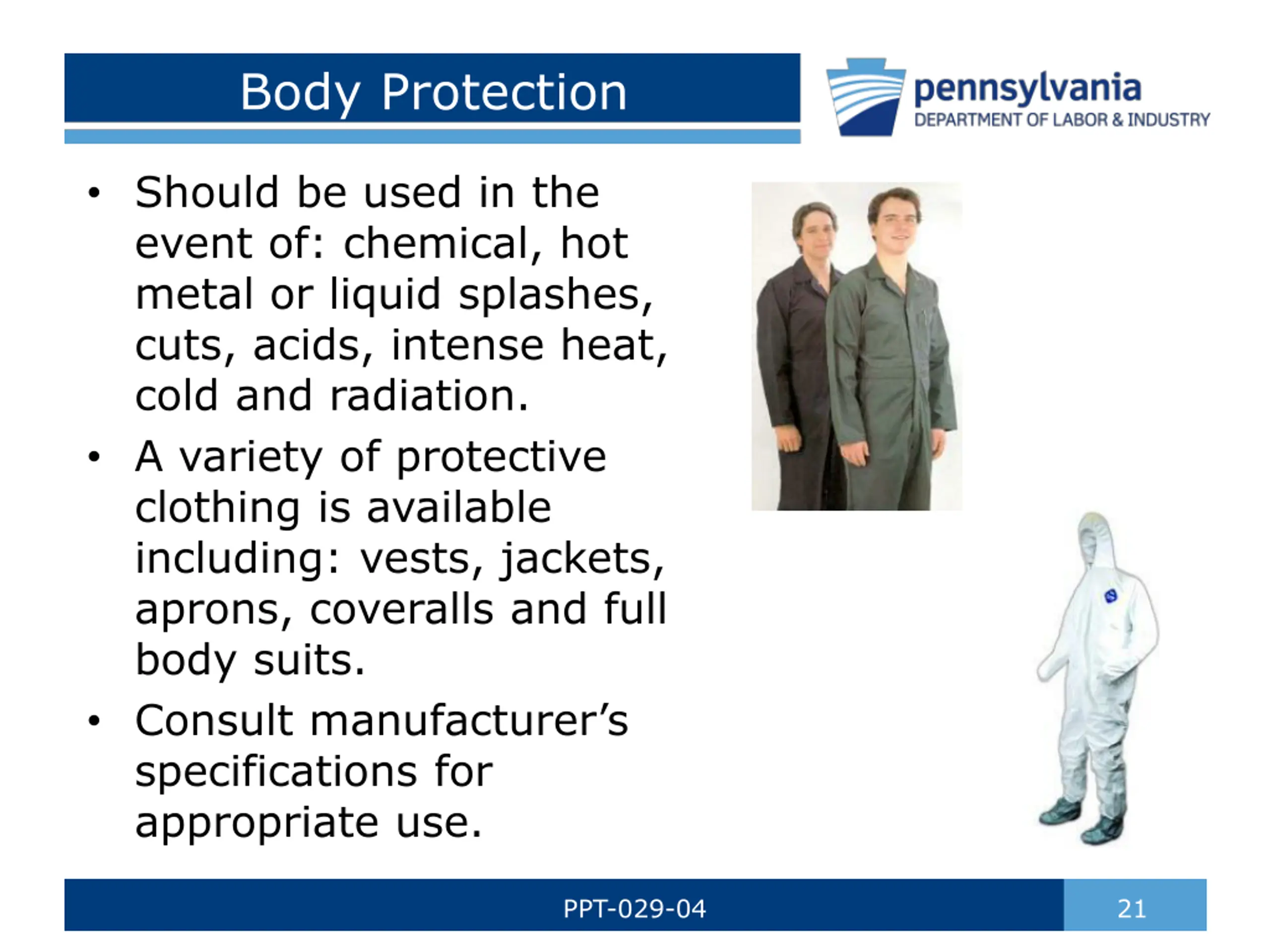 Body Protection Should be used in the event of: chemical, hot metal or liquid splashes, cuts, acids, intense heat, cold and radiation. A variety of protective clothing is available including: vests, jackets, aprons, coveralls and full body suits. Consult manufacturer s specifications for appropriate use. PPT-029-04 21