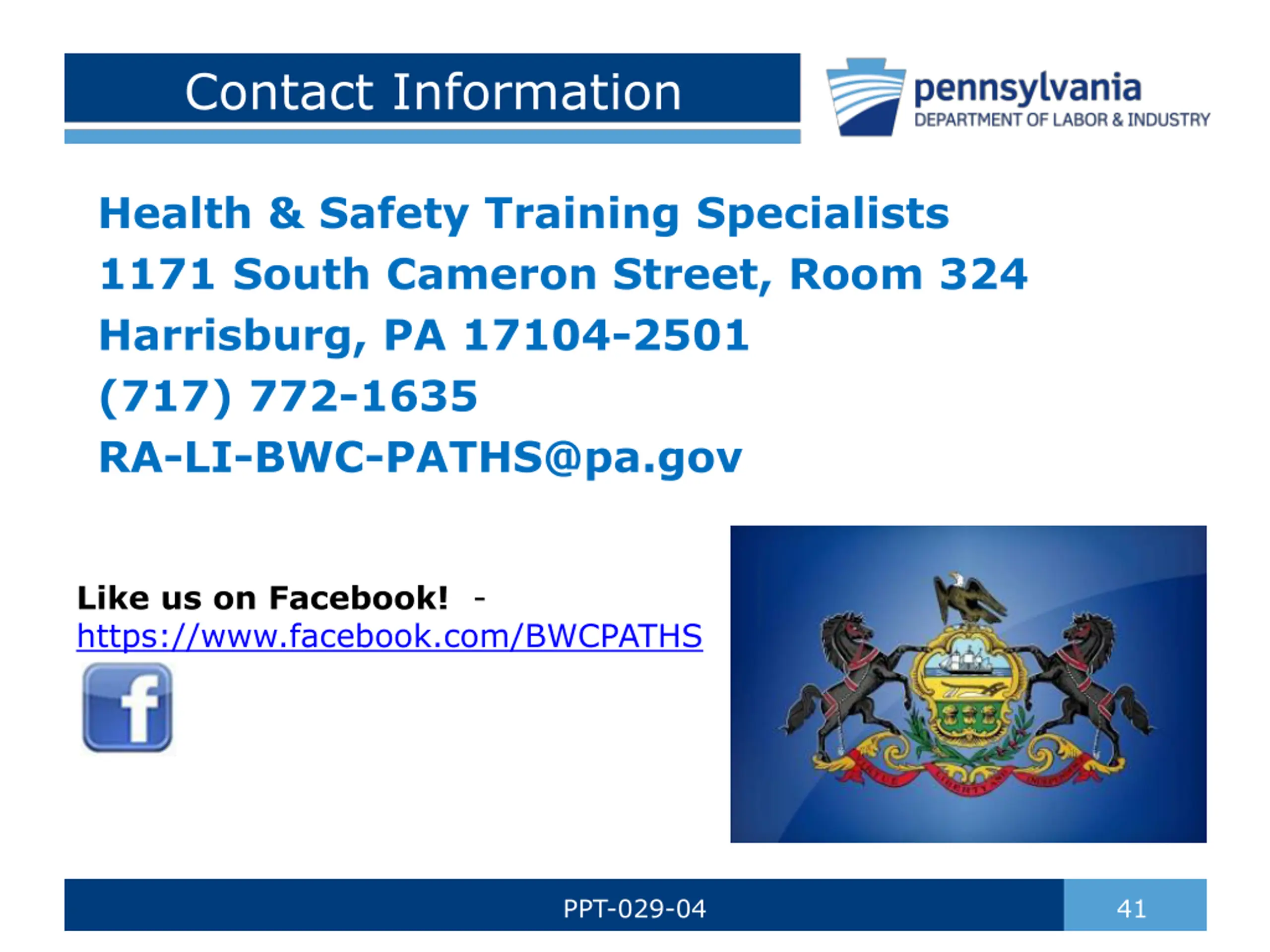 Contact Information Health & Safety Training Specialists 1171 South Cameron Street, Room 324 Harrisburg, PA 17104-2501 (717) 772-1635 RA-LI-BWC-PATHS@pa.gov Like us on Facebook! - https://www.facebook.com/BWCPATHS PPT-029-04 41