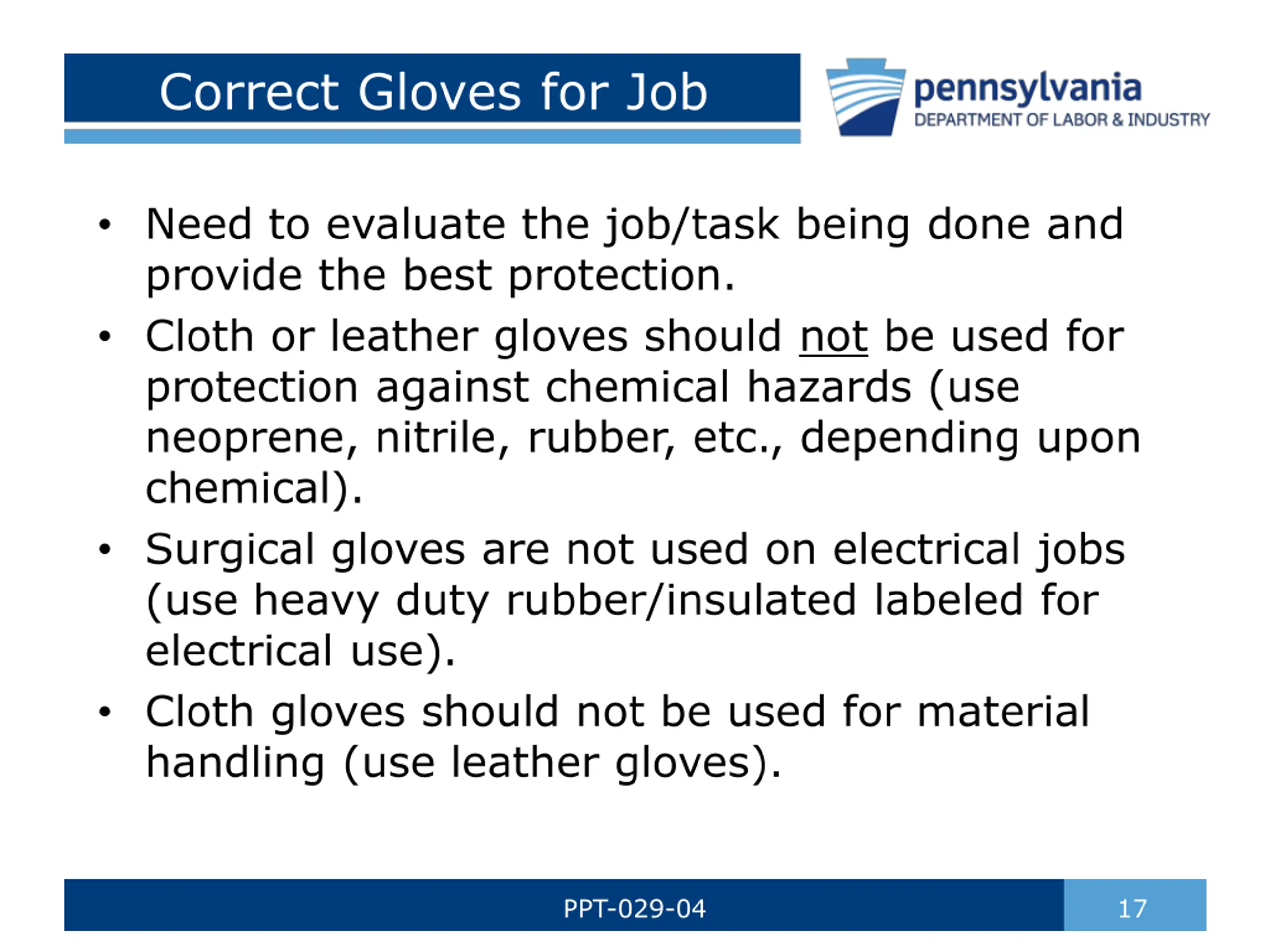Correct Gloves for Job Need to evaluate the job/task being done and provide the best protection. Cloth or leather gloves should not be used for protection against chemical hazards (use neoprene, nitrile, rubber, etc., depending upon chemical). Surgical gloves are not used on electrical jobs (use heavy duty rubber/insulated labeled for electrical use). Cloth gloves should not be used for material handling (use leather gloves). PPT-029-04 17