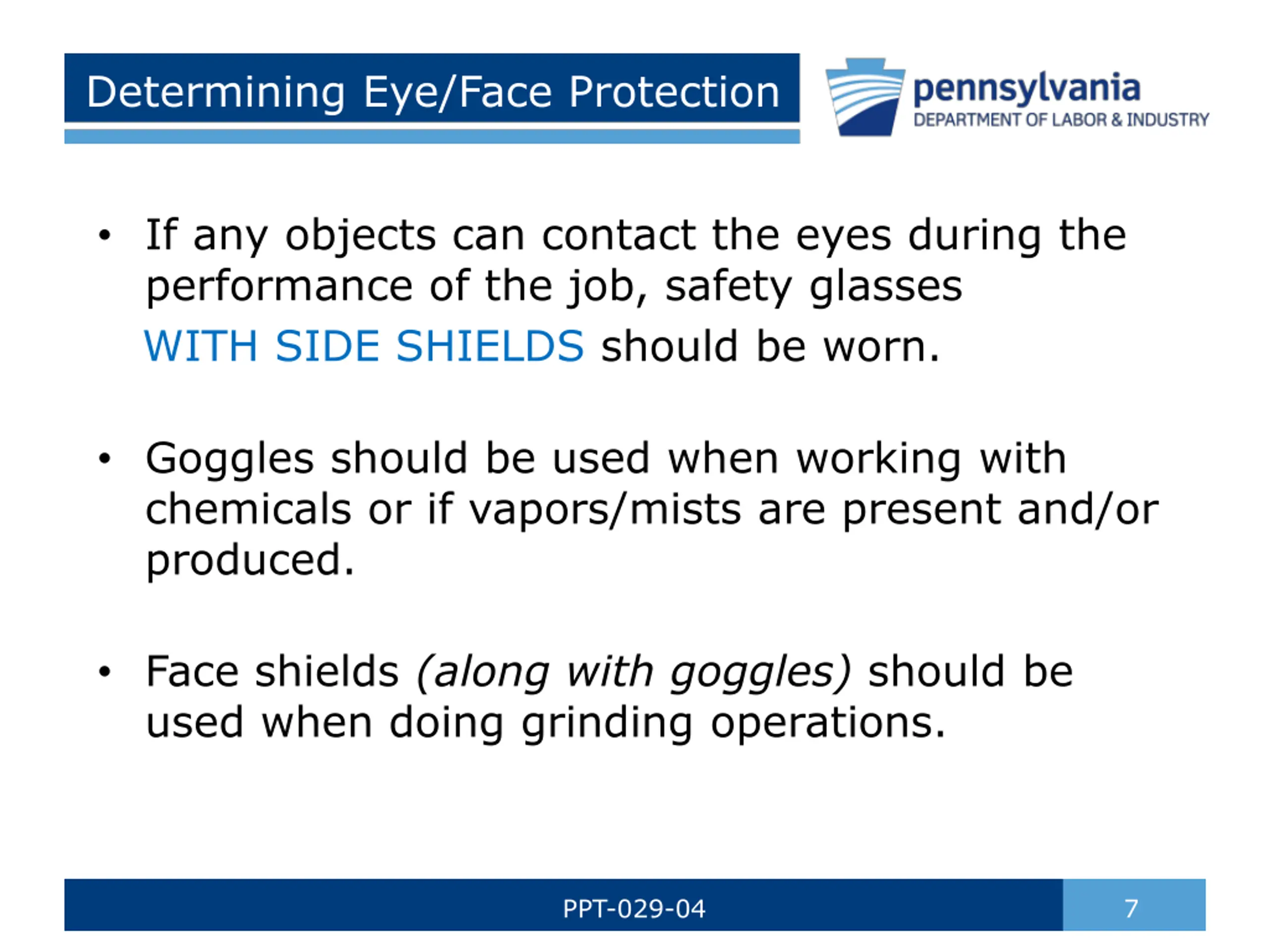 Determining Eye/Face Protection If any objects can contact the eyes during the performance of the job, safety glasses WITH SIDE SHIELDS should be worn. Goggles should be used when working with chemicals or if vapors/mists are present and/or produced. Face shields (along with goggles) should be used when doing grinding operations. PPT-029-04 7