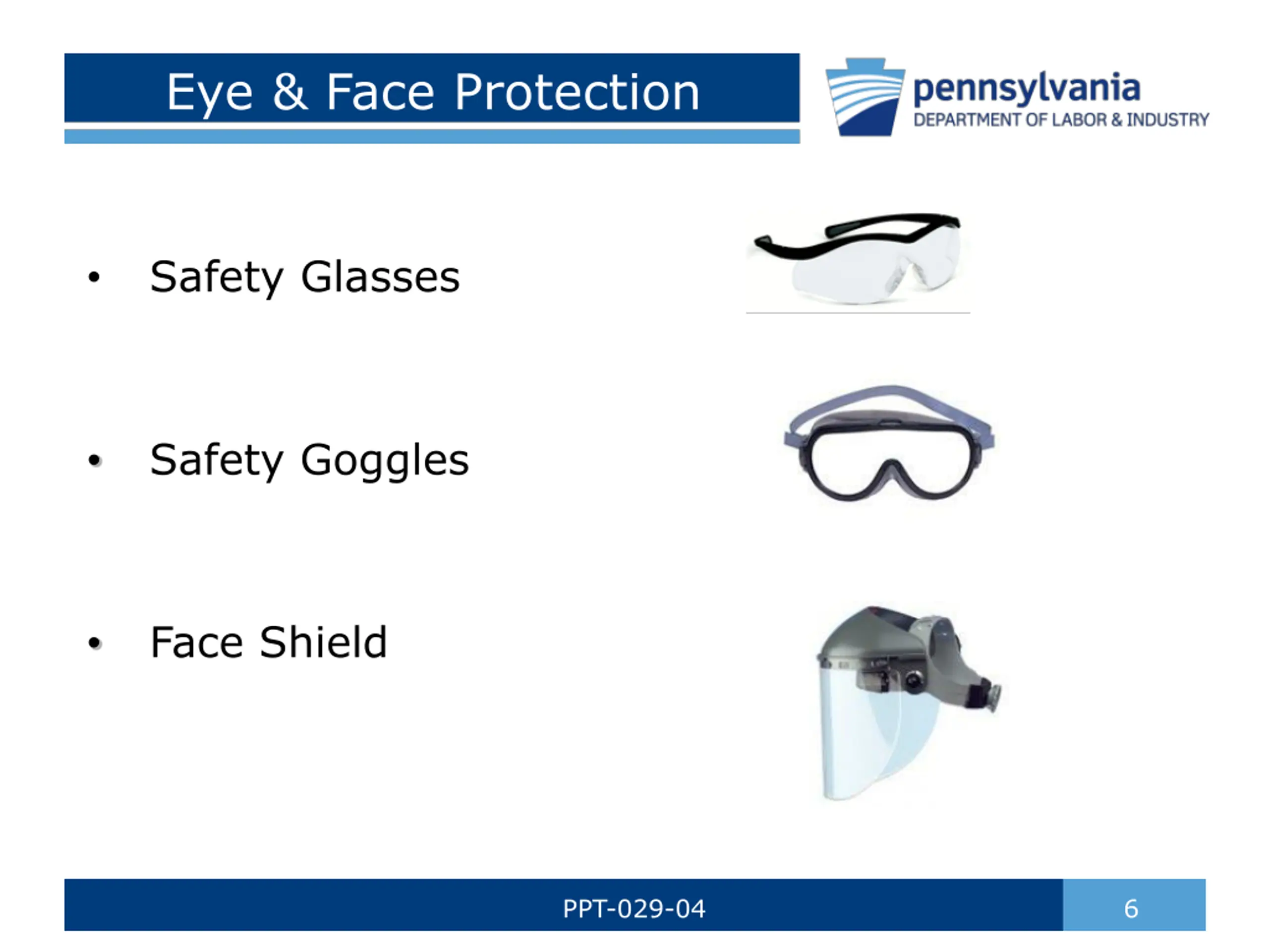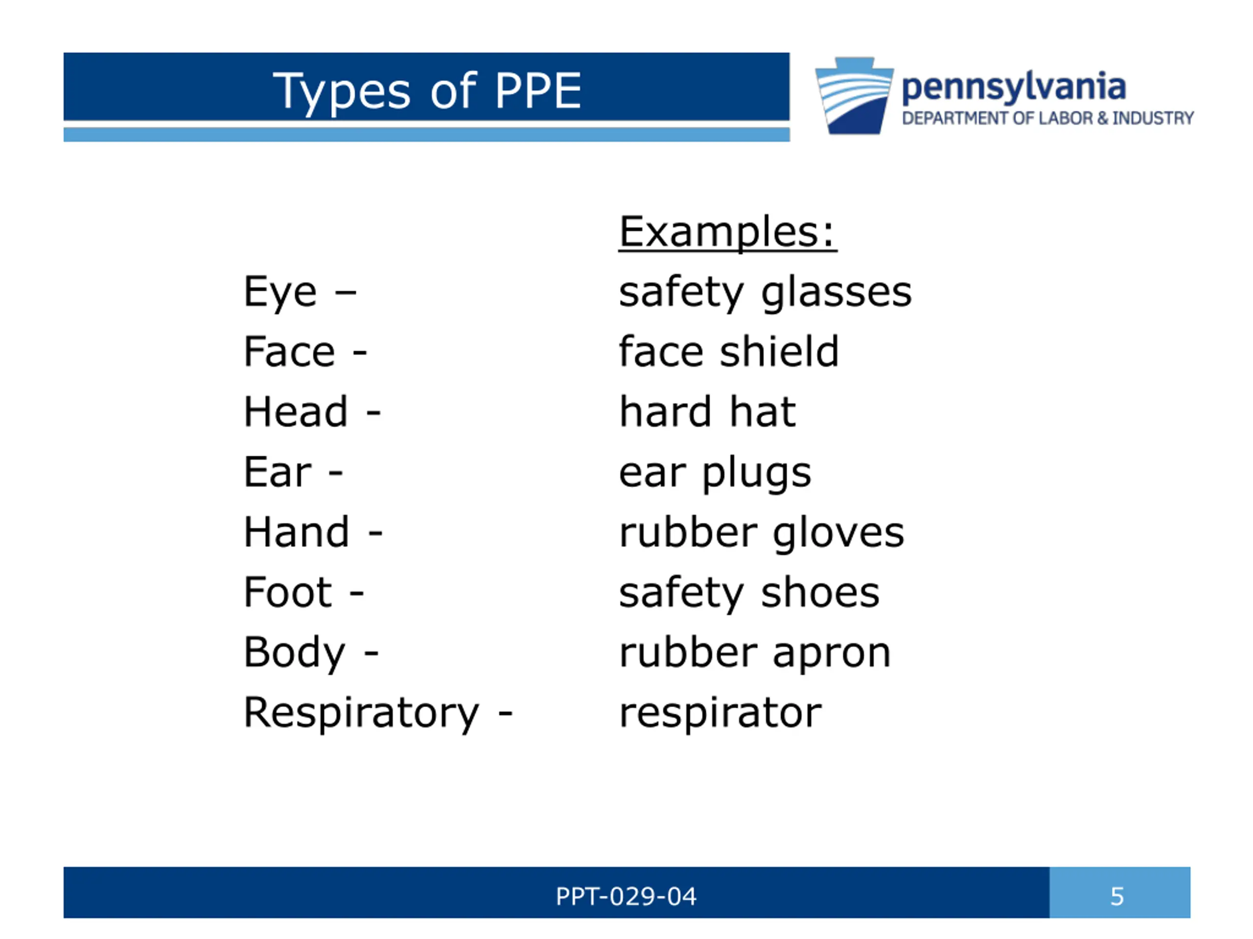 Types of PPE Examples: safety glasses face shield hard hat ear plugs rubber gloves safety shoes rubber apron respirator Eye Face - Head - Ear - Hand - Foot - Body - Respiratory - PPT-029-04 5
