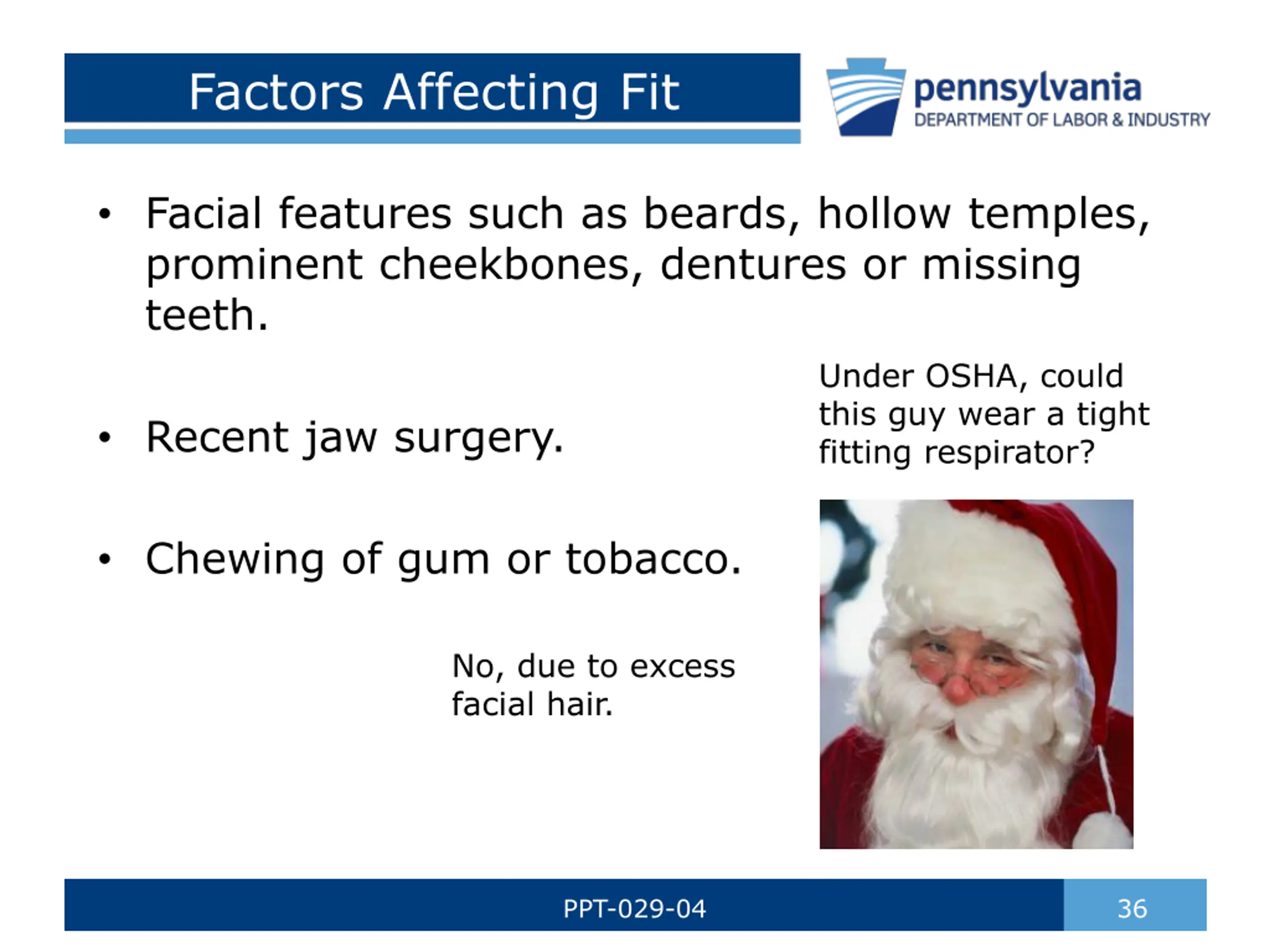 Factors Affecting Fit Facial features such as beards, hollow temples, prominent cheekbones, dentures or missing teeth. Under OSHA, could this guy wear a tight fitting respirator? Recent jaw surgery. Chewing of gum or tobacco. No, due to excess facial hair. PPT-029-04 36