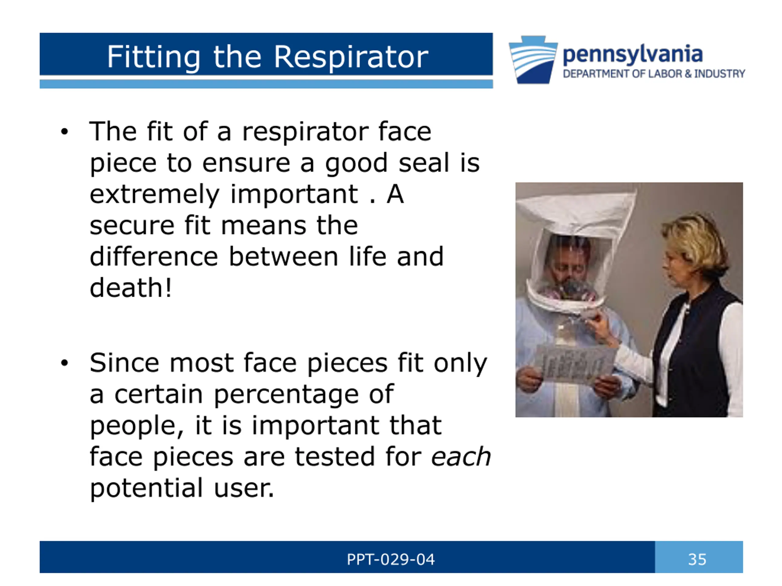 Fitting the Respirator The fit of a respirator face piece to ensure a good seal is extremely important . A secure fit means the difference between life and death! Since most face pieces fit only a certain percentage of people, it is important that face pieces are tested for each potential user. PPT-029-04 35