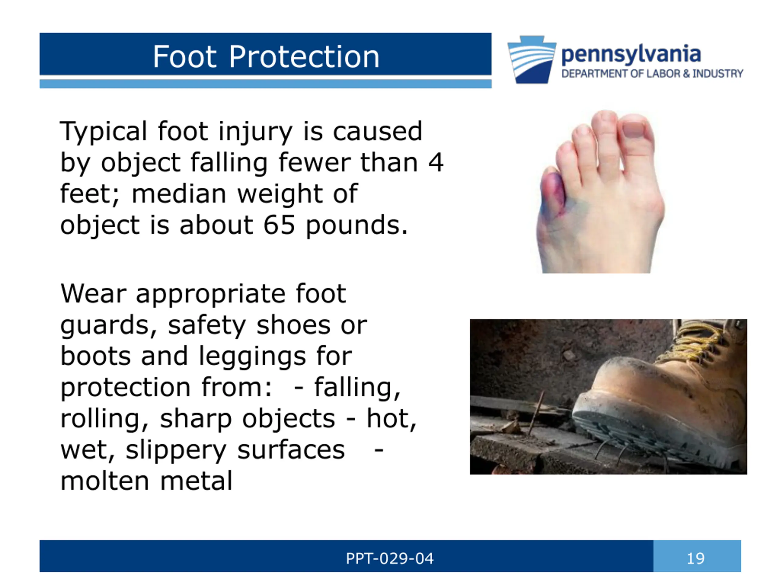 Foot Protection Typical foot injury is caused by object falling fewer than 4 feet; median weight of object is about 65 pounds. Wear appropriate foot guards, safety shoes or boots and leggings for protection from: - falling, rolling, sharp objects - hot, wet, slippery surfaces - molten metal PPT-029-04 19