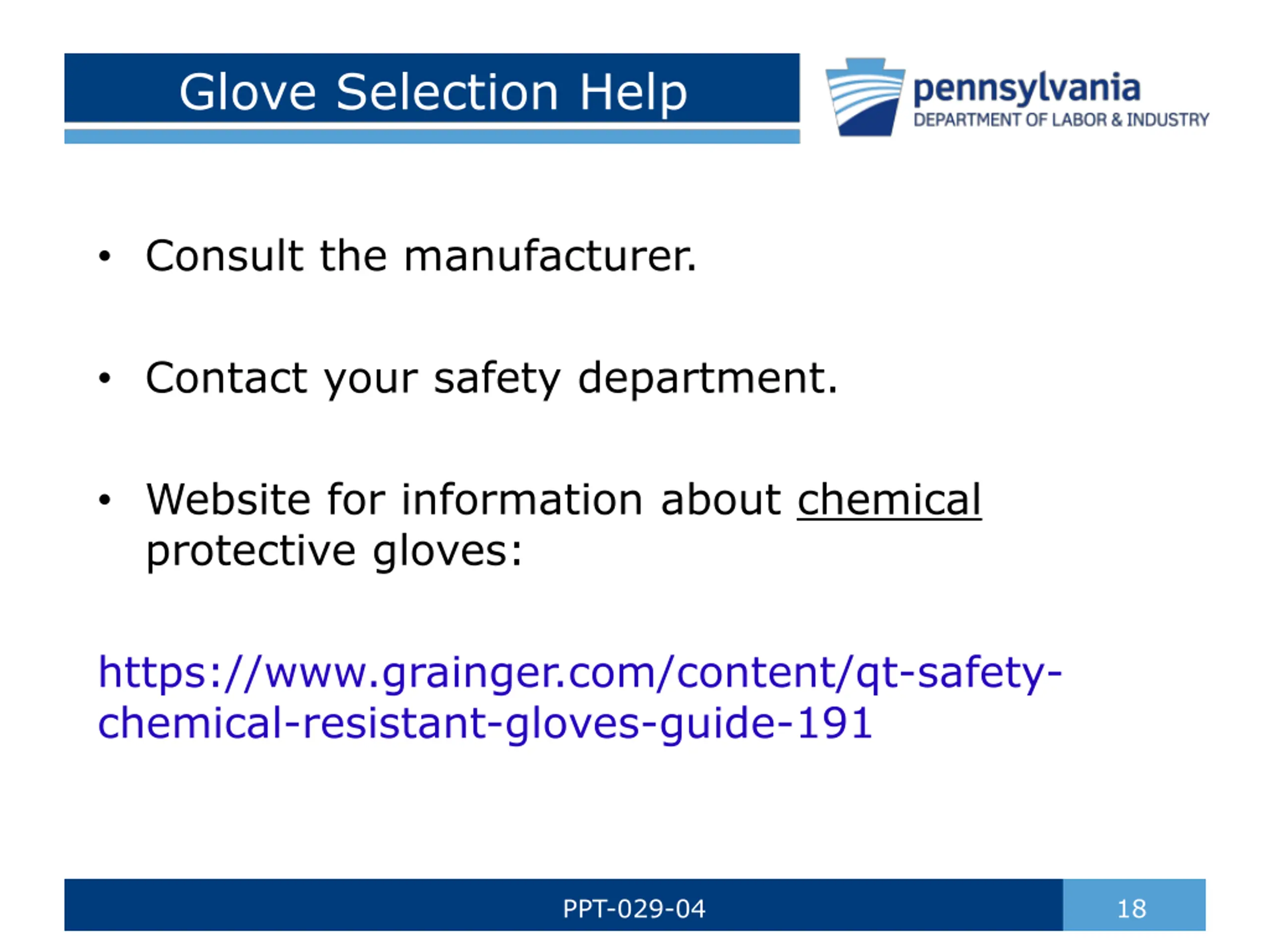 Glove Selection Help Consult the manufacturer. Contact your safety department. Website for information about chemical protective gloves: https://www.grainger.com/content/qt-safety- chemical-resistant-gloves-guide-191 PPT-029-04 18