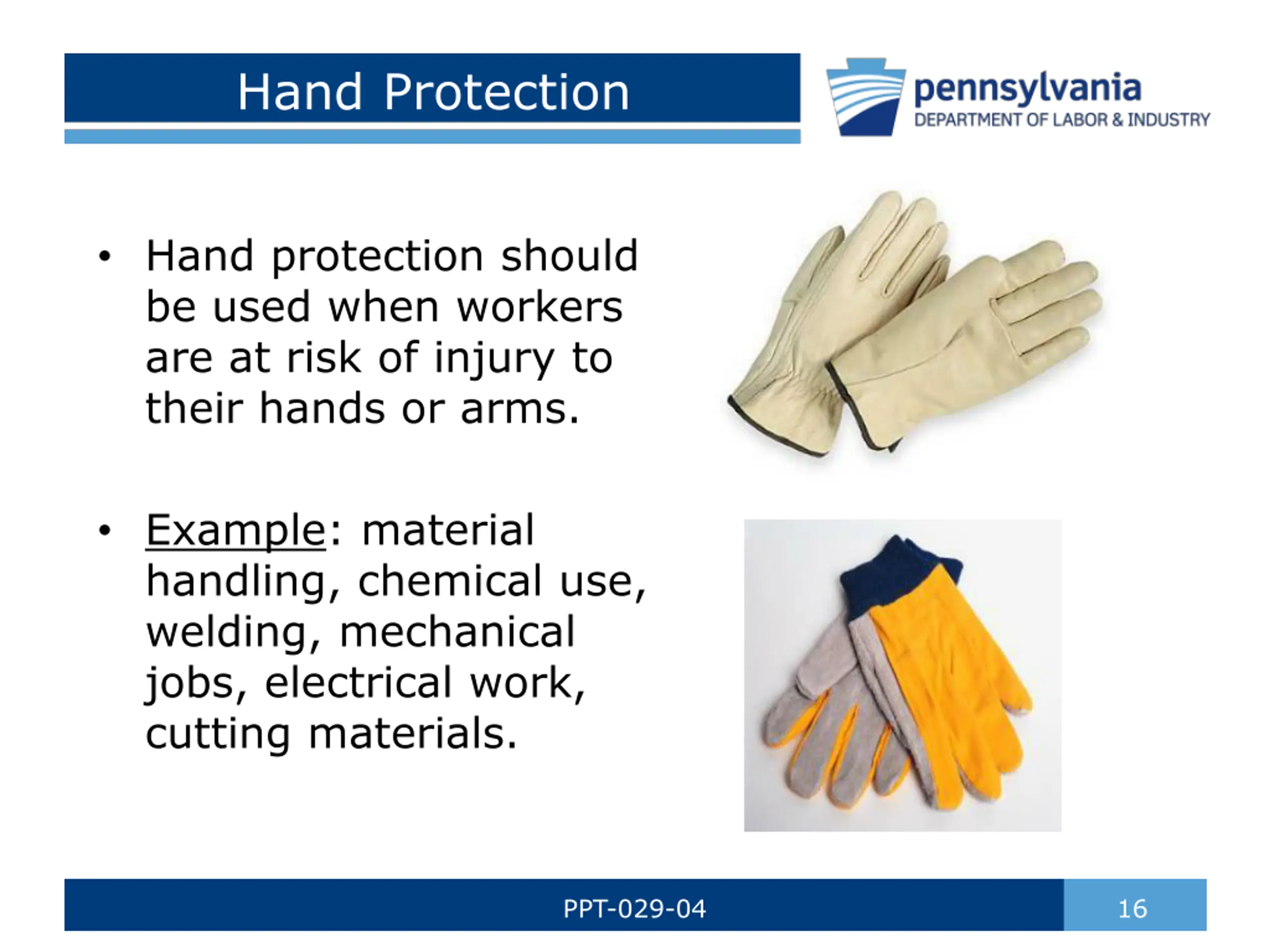Hand Protection Hand protection should be used when workers are at risk of injury to their hands or arms. Example: material handling, chemical use, welding, mechanical jobs, electrical work, cutting materials. PPT-029-04 16