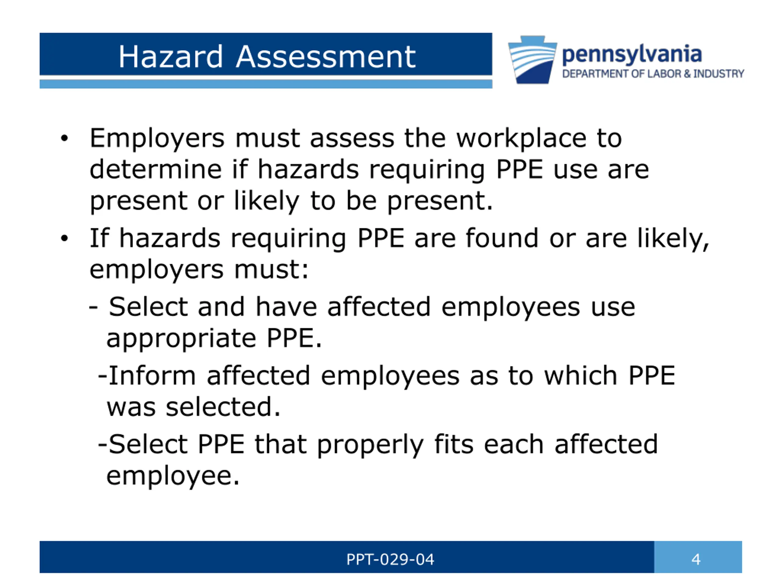 Hazard Assessment Employers must assess the workplace to determine if hazards requiring PPE use are present or likely to be present. If hazards requiring PPE are found or are likely, employers must: - Select and have affected employees use appropriate PPE. -Inform affected employees as to which PPE was selected. -Select PPE that properly fits each affected employee. PPT-029-04 4